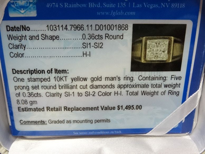 10 Kt. YG Man's Ring 5 Prong Set Brilliant Diamond w/Appr. ($1,495.00)