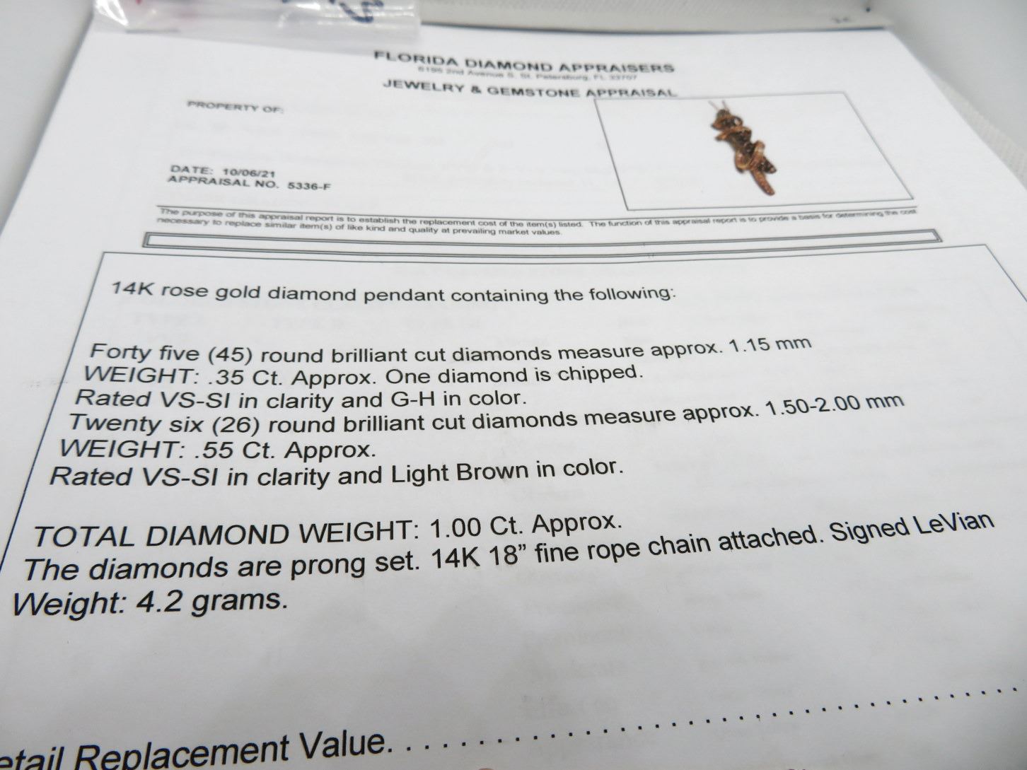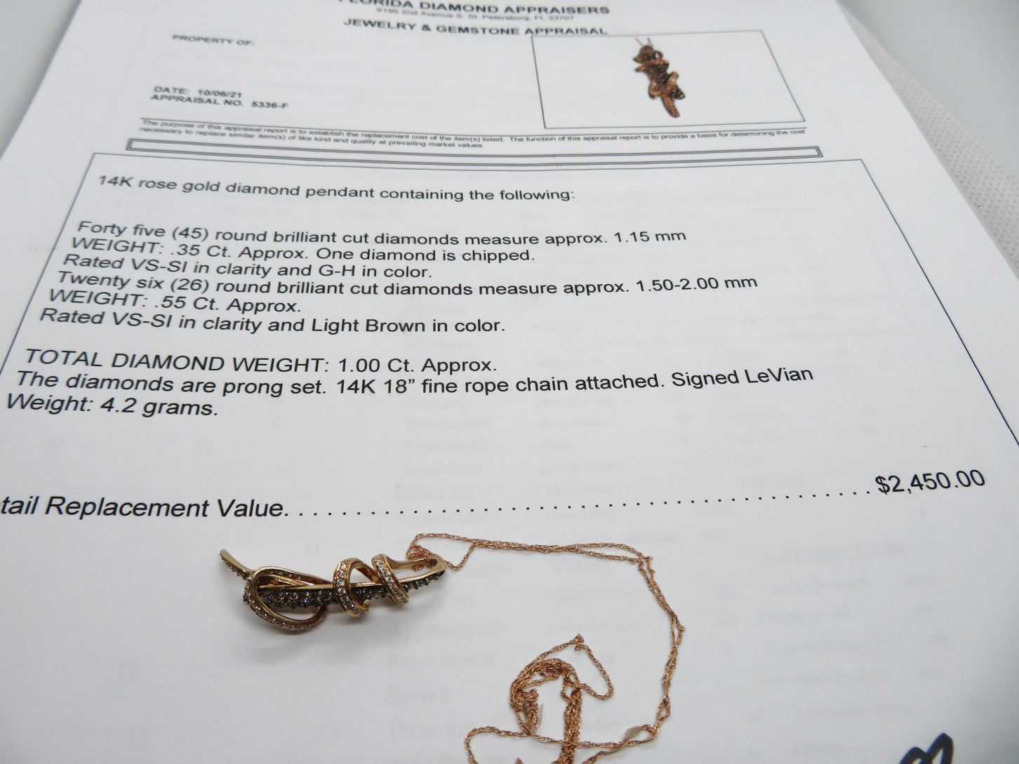 Diamonds and 26 Round Cut Diamonds in Light Brown Color (Chocolate) w/14K 18" Fine Rope Chain LeVian 4.2g - Replacement Value - $2,450.00