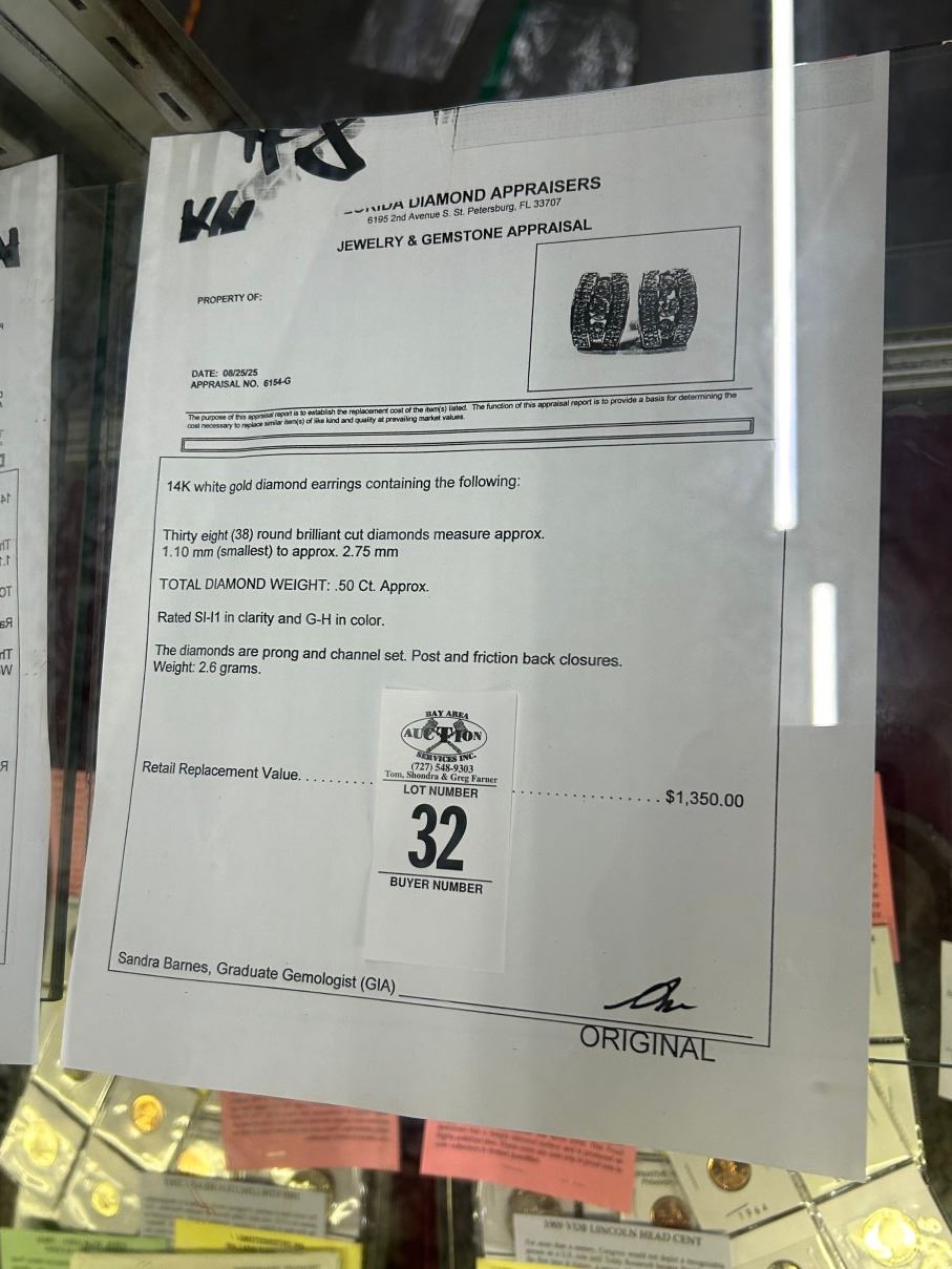 14K WG Diamond Earrings w/32 Round Cut Diamonds 2.6G - Replacement Value - $1,350.00