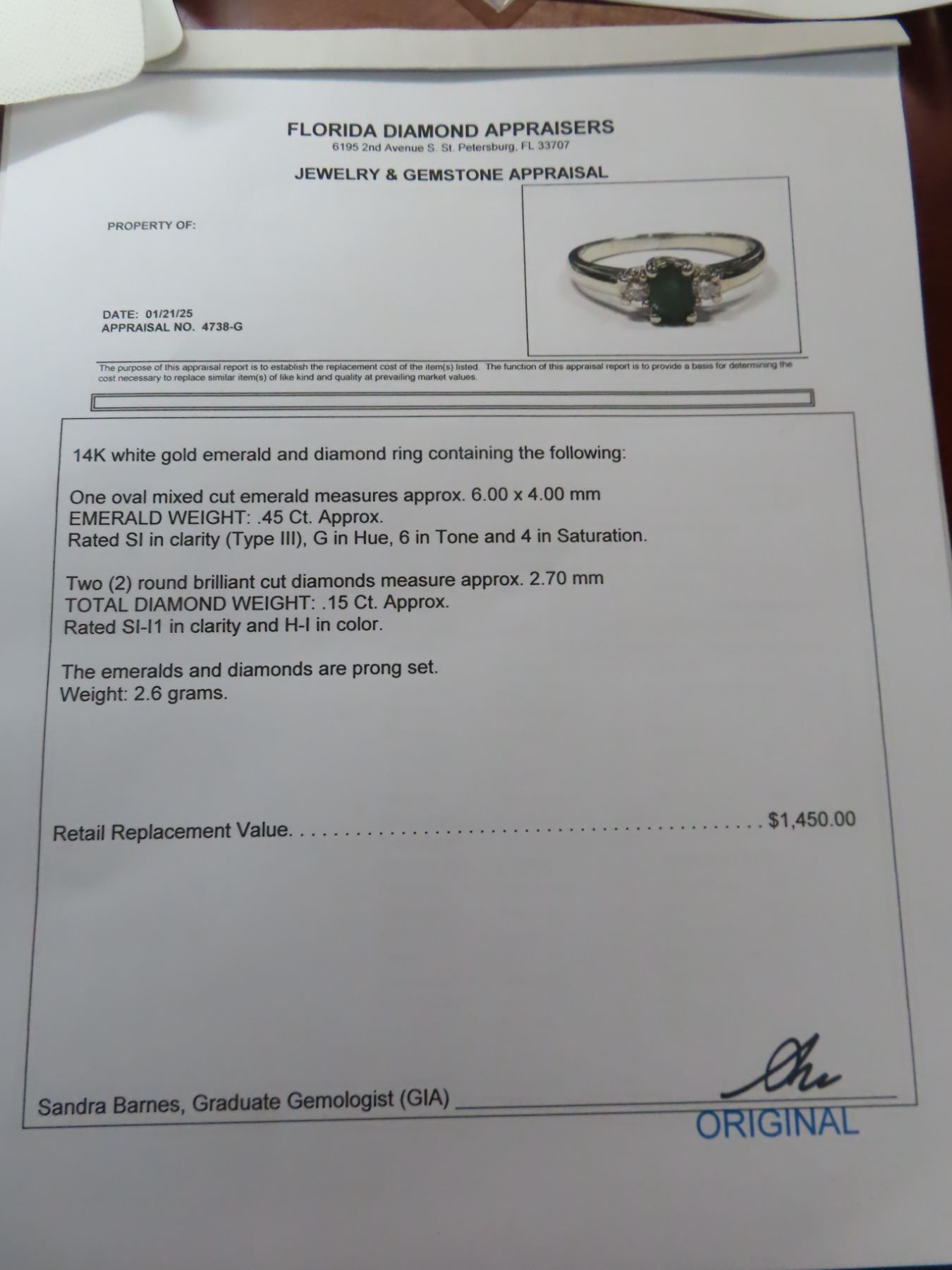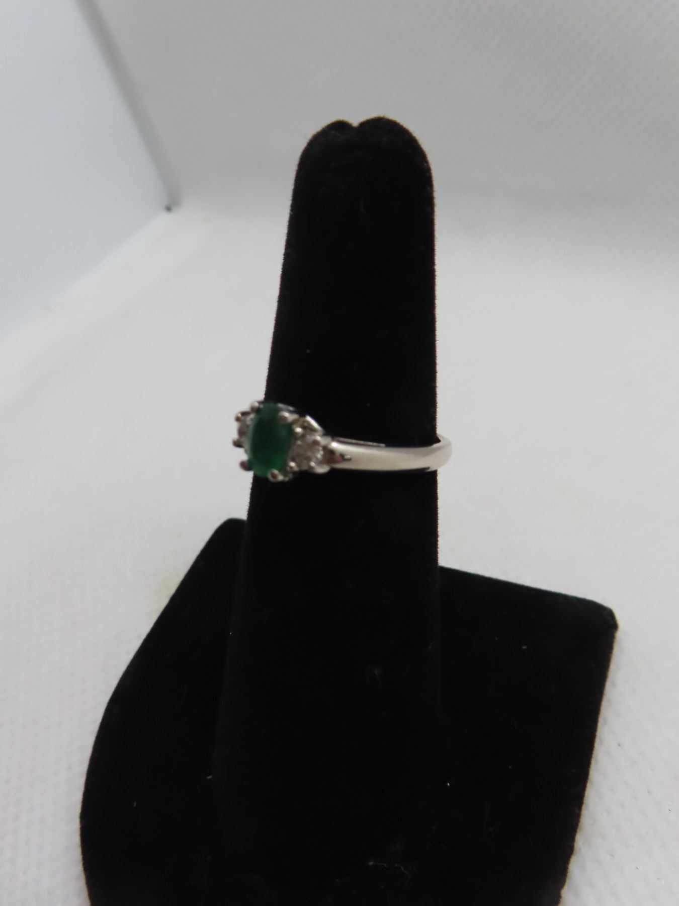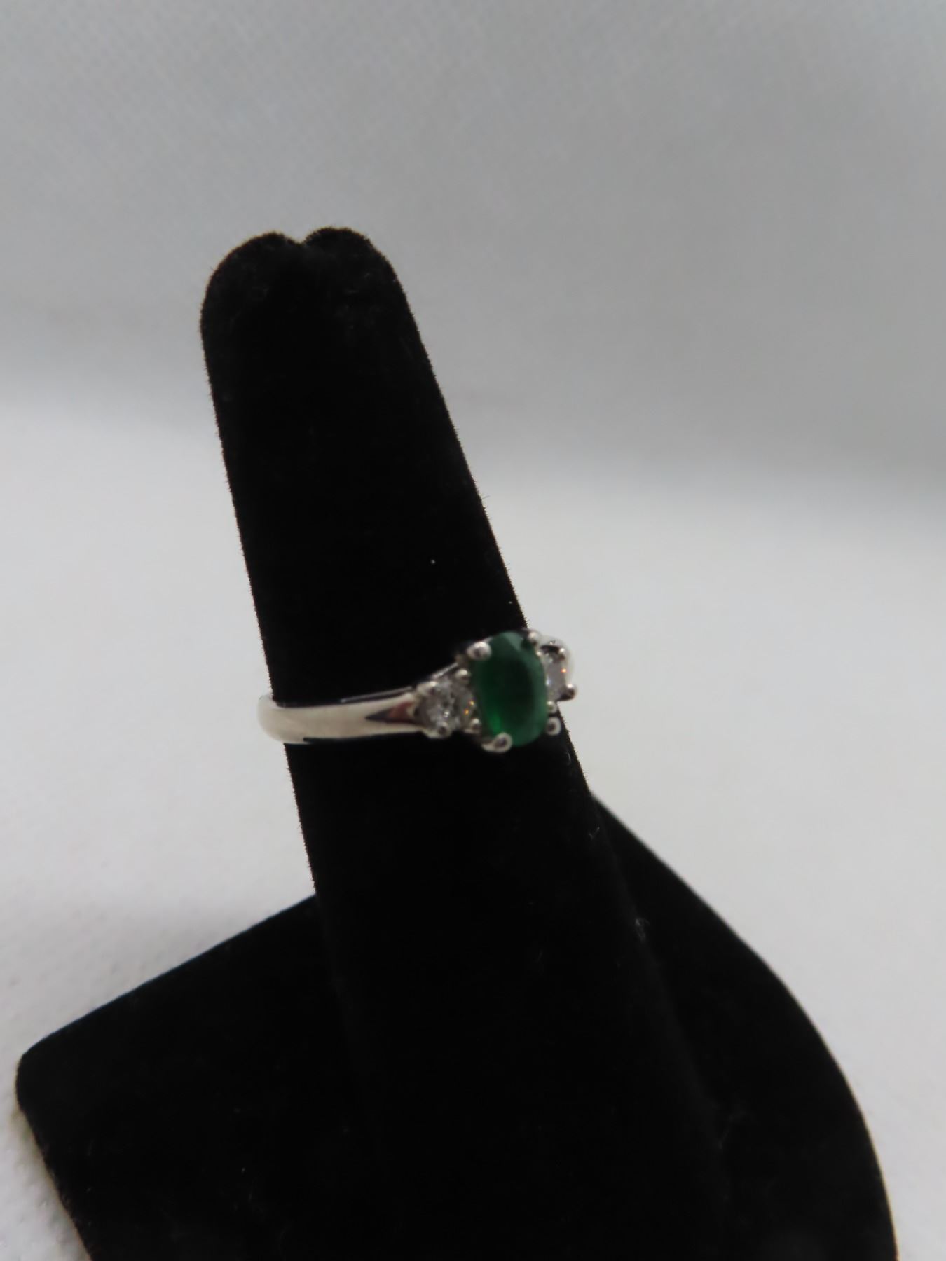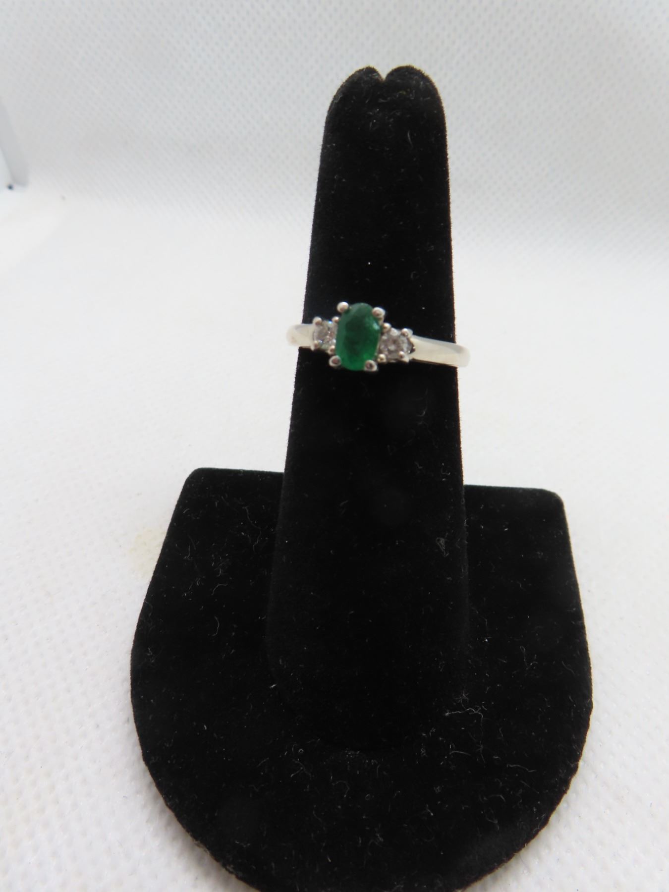 14K WG Emerald and Diamond Ring w/One Oval Cut Emerald and 2 Round Cut