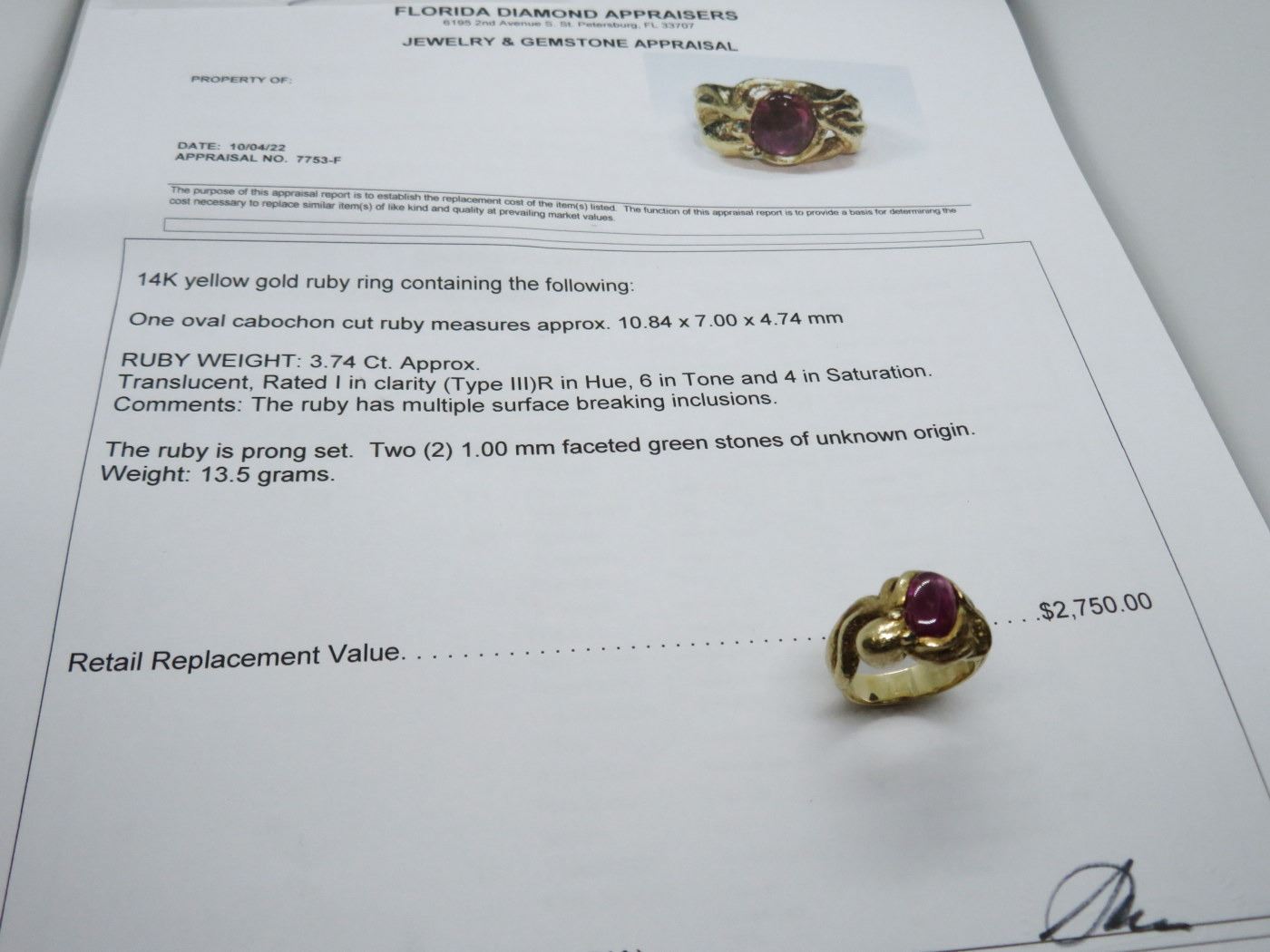 14K YG Ruby ring w/One Oval Cabochon Cut Ruby 13.5g Replacment Value $2,750