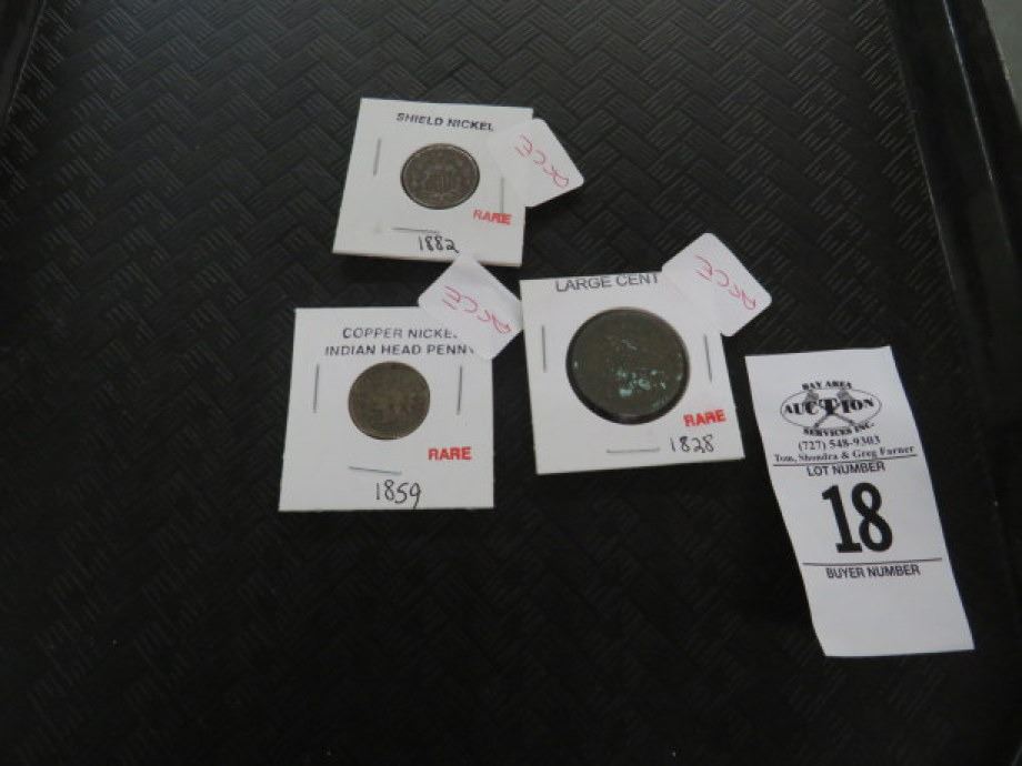 1828 Large Cent, 1850 Copper Nickel, 1882 Shield Nickel