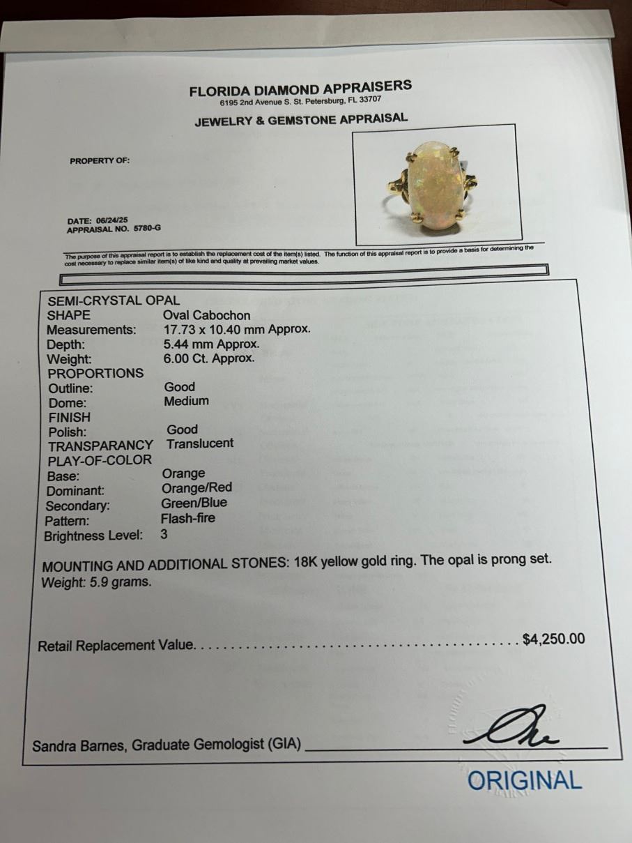 18K YG Ring w/Large Opal Oval In Shape 5.9g - Replacement Value - $4,250.00