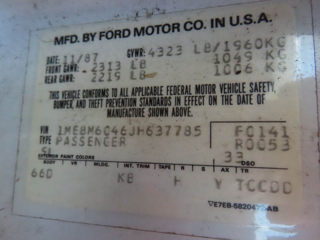 White/Navy Cloth, Auto, A/C, Stereo, PW, PL, CC, 3.8L, V6, Bumper Trim Paint Faded, Overall Clean, Shows Only 65,904 Mi. - Exempt - Vin # 1MEBM6046JH637785