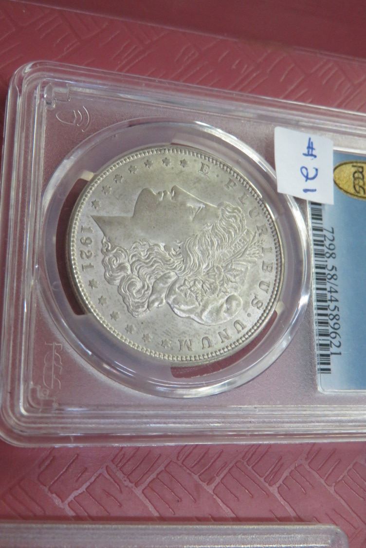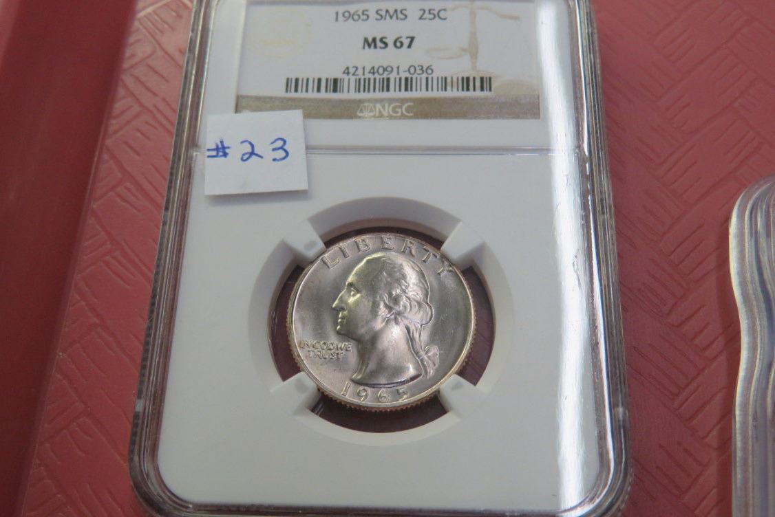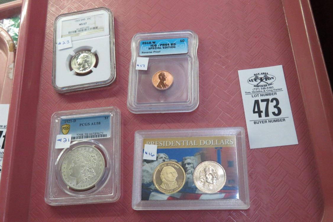 Graded 2019-W Proof Lincoln Cent, Graded AU58 1921-D Silver Morgan, Graded 1965 MS67 Washington Quarter