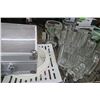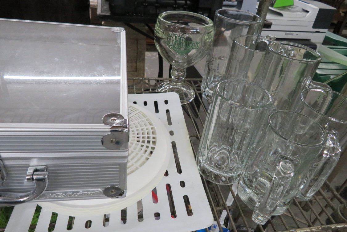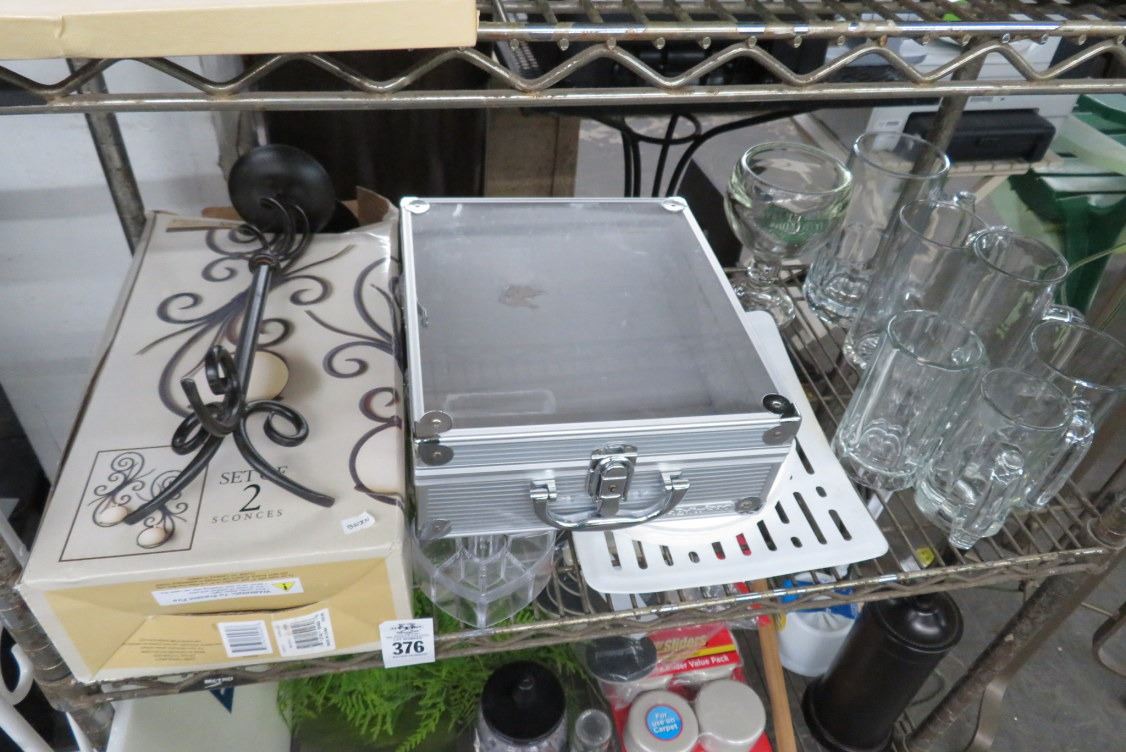 2 Shelf of Asst. Glasses, Wall Scones, Super Sliders Display Case
