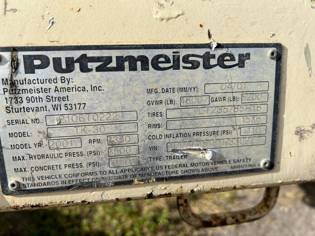 2001 Putzmeister #TK30 Concrete Pump, 1931 Hrs. - Vin # 30222 - Nds. Service