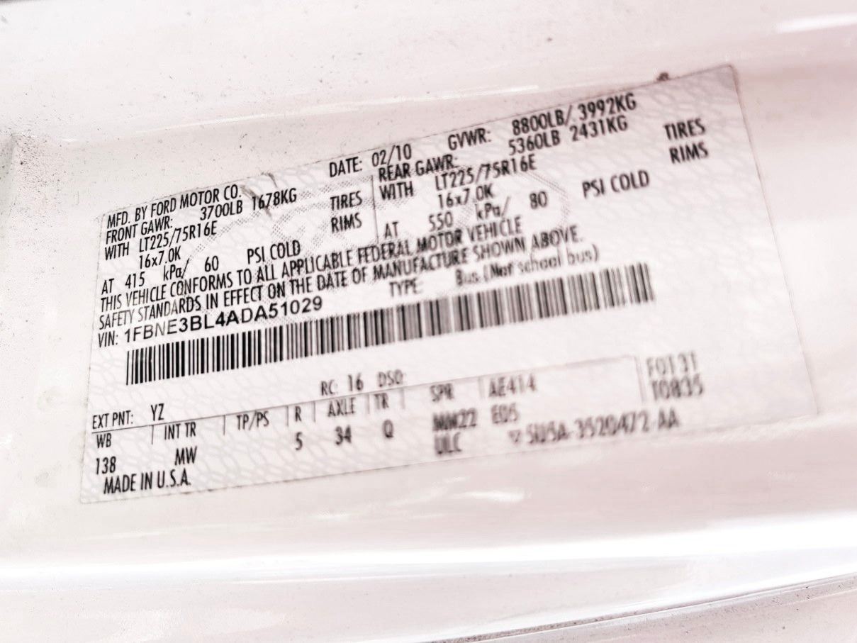 Wht/Beige Cloth, 2 Buckets/One Bench, Auto, A/C, Stereo/CD, PW, PL, PM, CC, Trlr Brks, Tint, Hitch, 5.4L, V8, Slight Dmg DS Fndr/Dr, Overall Clean, Shows 306,478 Mi. - Exempt - Vin # 1FBNE3BL4ADA51029