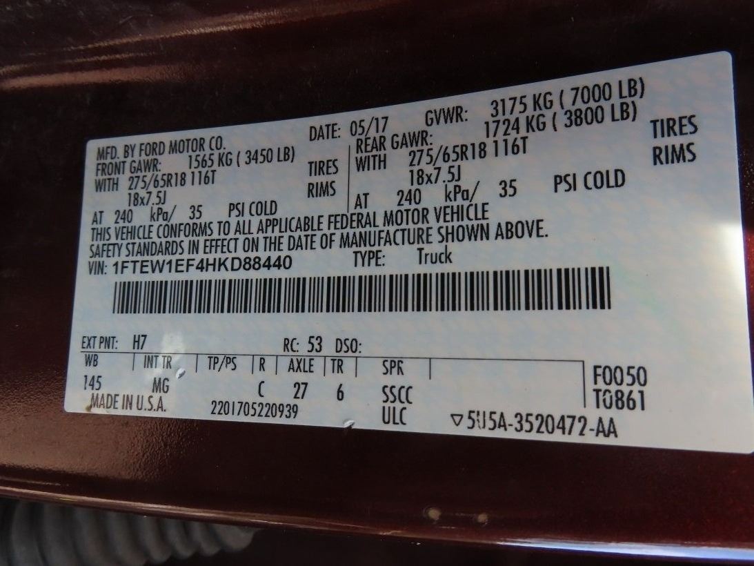 Maroon/Grey Cloth 6 Seat, Auto, A/C, Stereo/Media, PW, PL, PM, PS, CC, Step Brs, Tint, Alloys, DP Toolbox, Reese Hitch, 5.0L, V8, Dented DS Rear Bed/Bumper, Shows 177,670 Mi. - Vin # 1FTEW1EF4HKD88440 Runs and Drives *2-4WKS FOR TITLE*