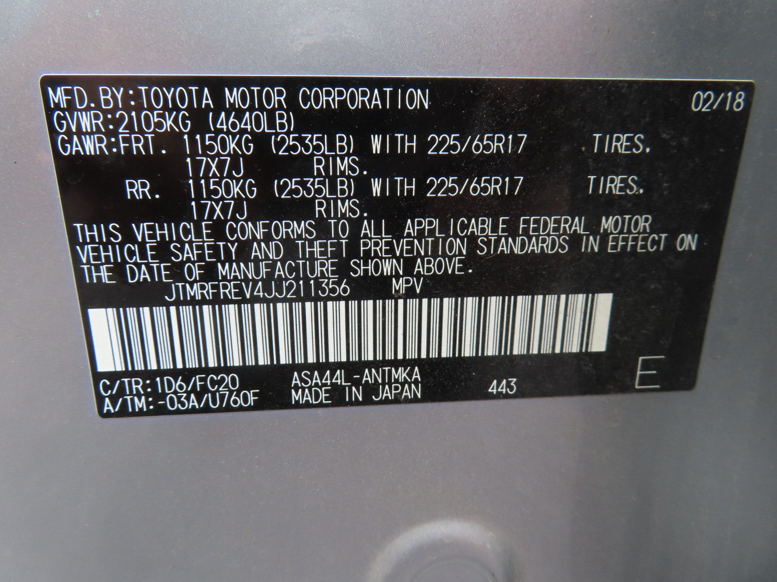 Silver/Blk Cloth, Auto, A/C, Stereo/Media, PW, PL, PM, PS, CC, Psr, Roof Rack, Reese Hitch, Alloys, Tint, Small Dent DS Rear Qtr, Scratches, 2.5L, 4 Cyl. Clean, Shows 66,229 Mi. - Vin # JTMRFREV4JJ211356
