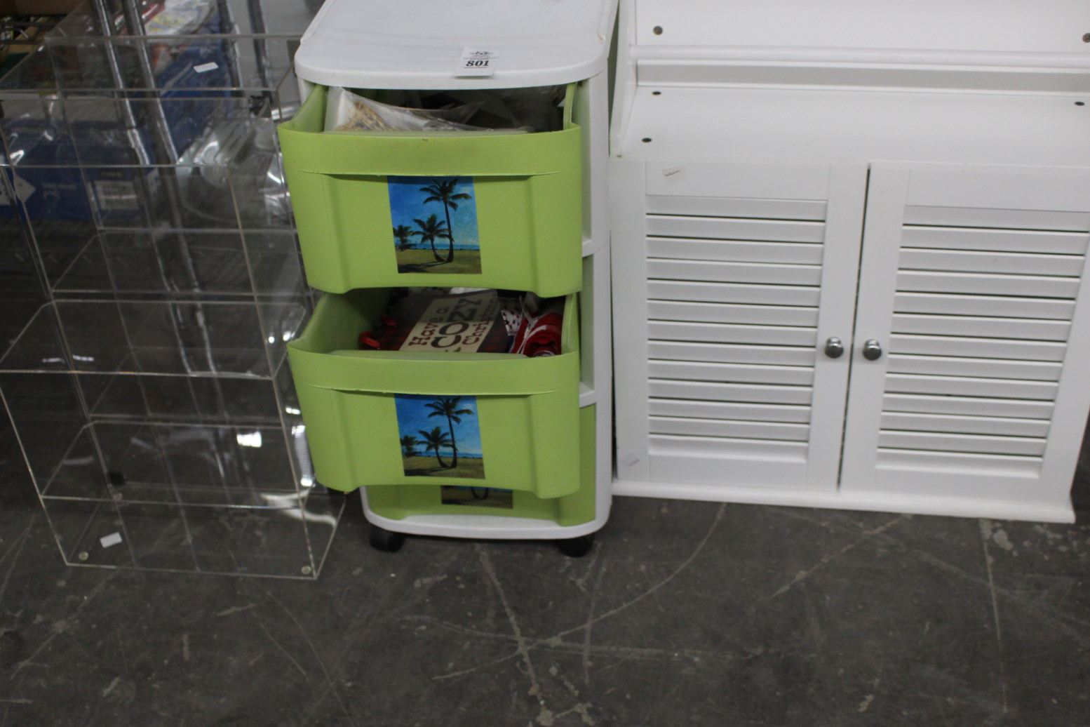 3 Drawer Bin Cabinet, White Wall Cabinet w/Hanger, Plexi Glass Displays