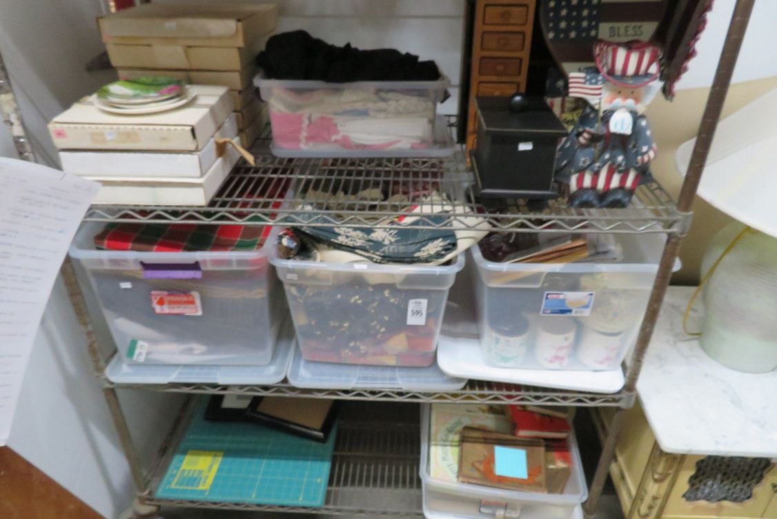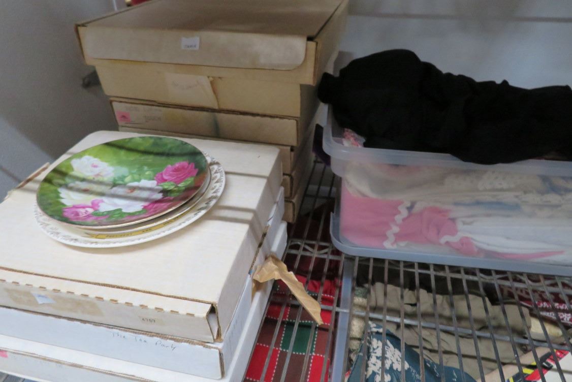 3 Shelf Lot of Collector Plates, Linens, Books & More