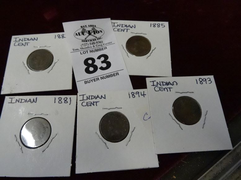 5 Indian Head Cent 1881, 1883, 1885, 1893, 1894 - 5 Times the Money