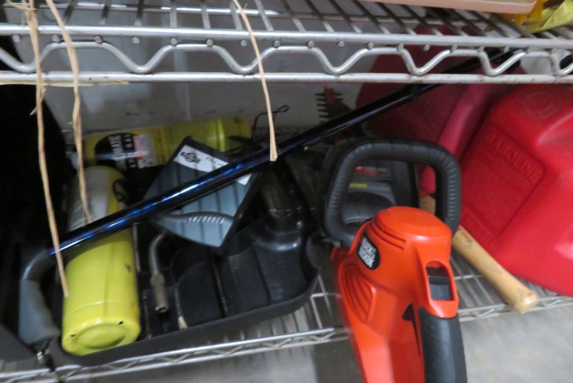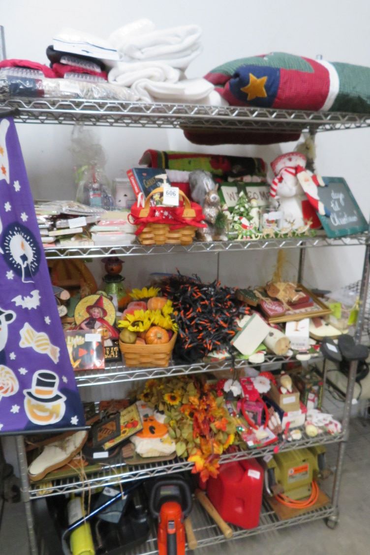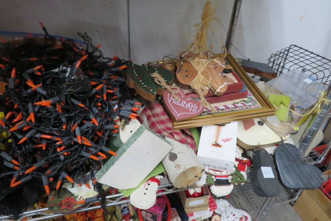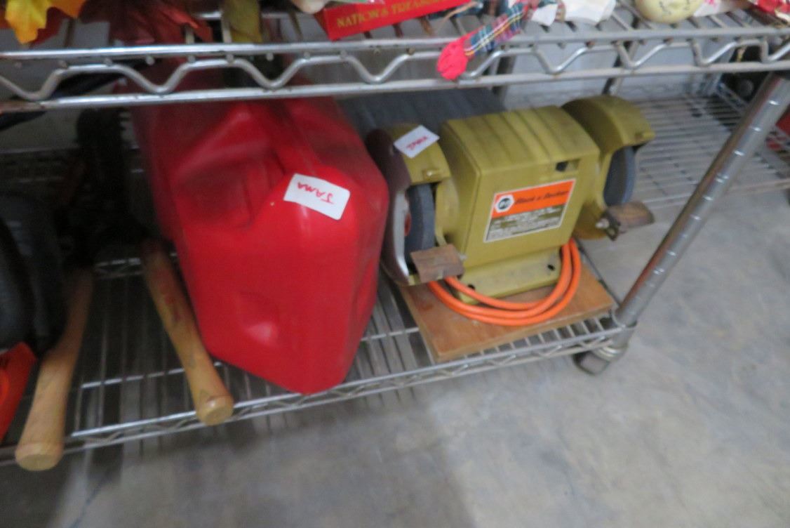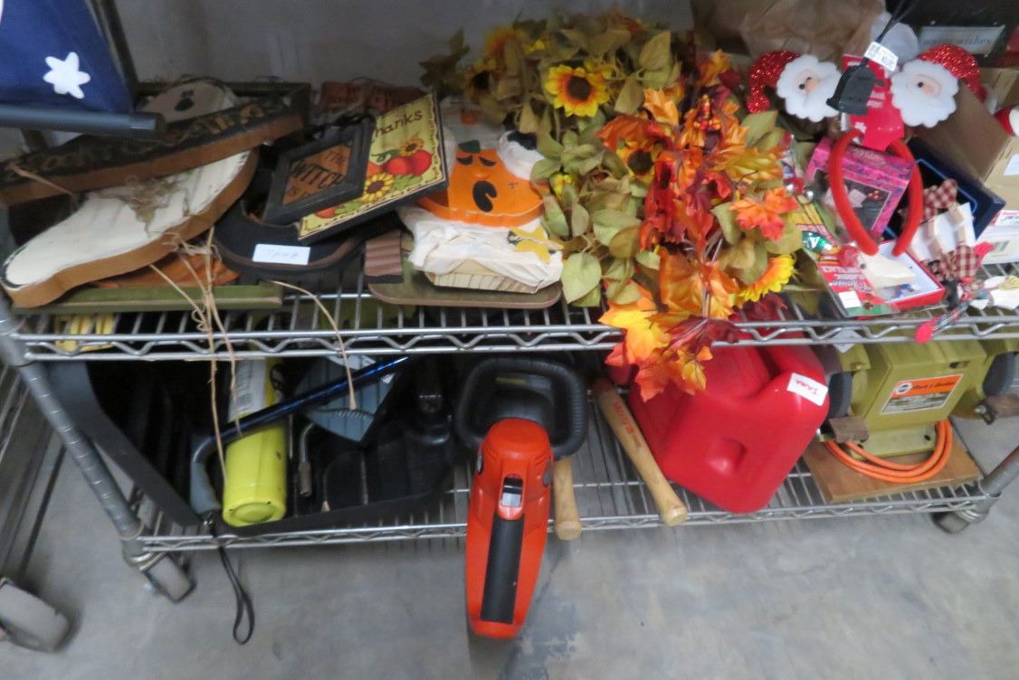 5 Shelf Lot of Holiday Décor, Bench Grinder, Garden Tools