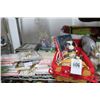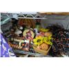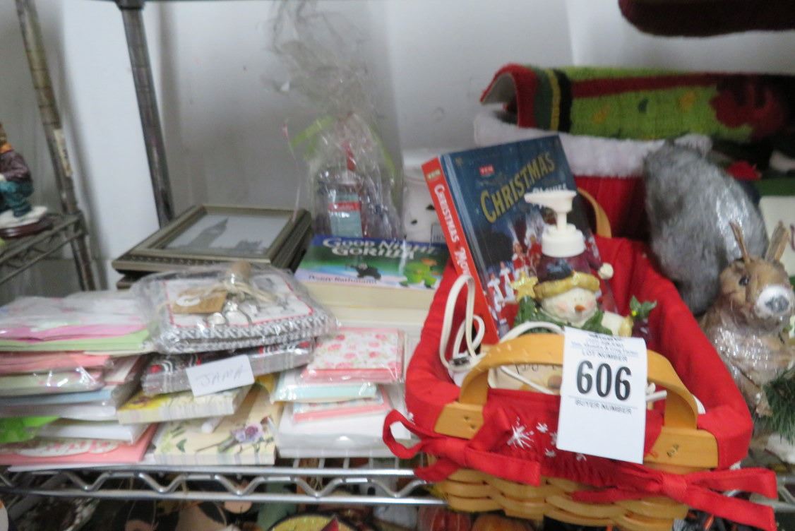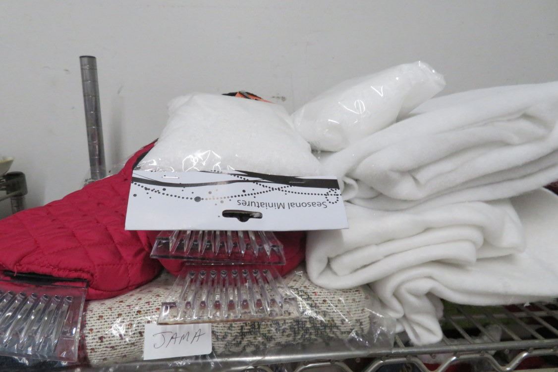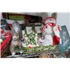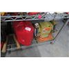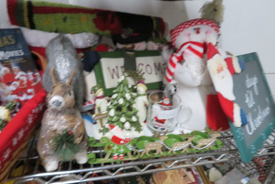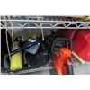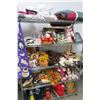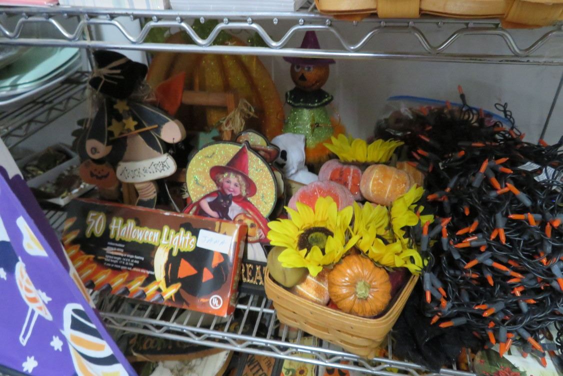 5 Shelf Lot of Holiday Décor, Bench Grinder, Garden Tools