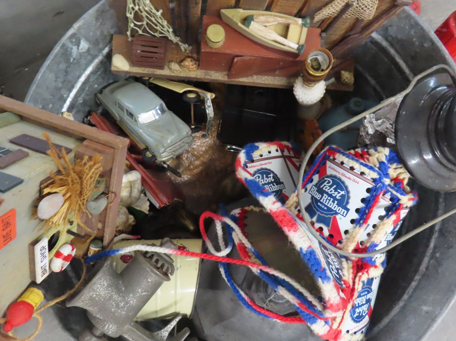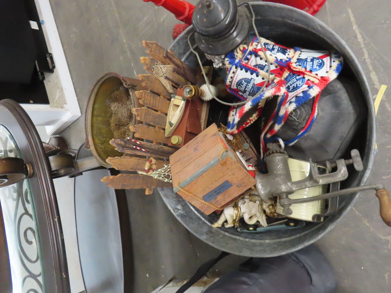 Alum. Tub w/Asst. Vintage Lantern, Grinder, Canister, Light and More