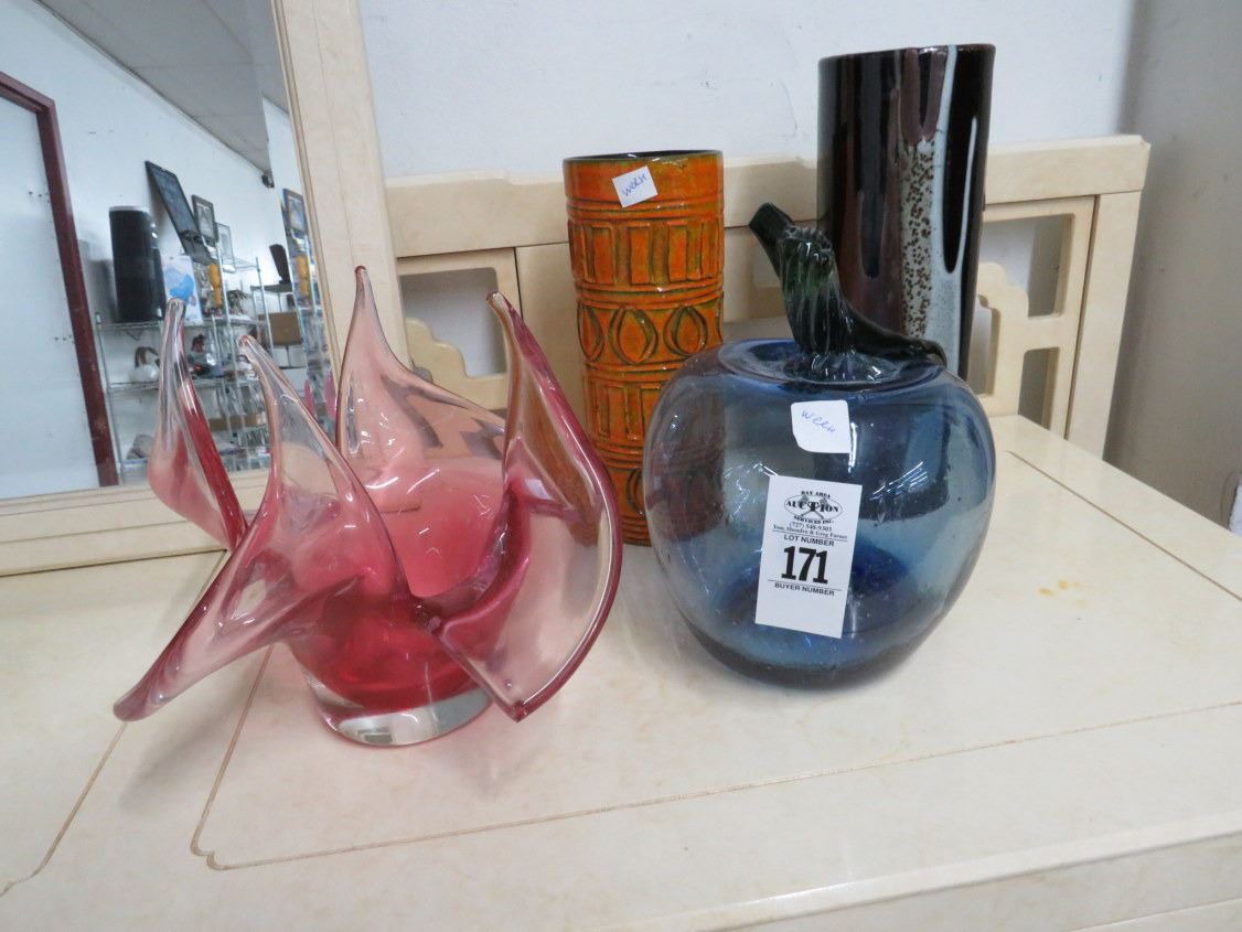 Art Glass Apple, Mauve Vase, 2 Glazed Vases