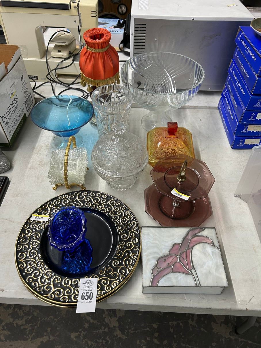 Art Glass, Carnival Glass, Bowls, Ashtrays, Serving Plates, Leaded Glass Box, Lamp