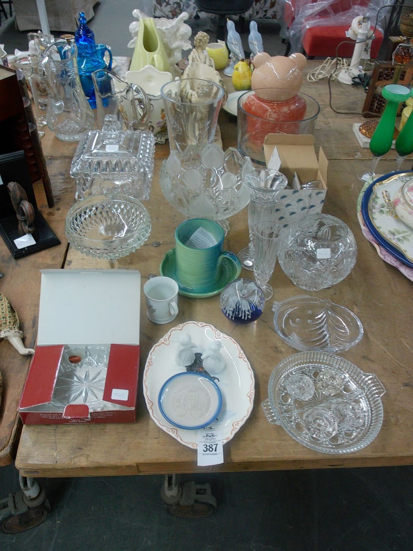 Art Glass Paperweight Bowl, Crystal Pitcher, Vase, Table Items