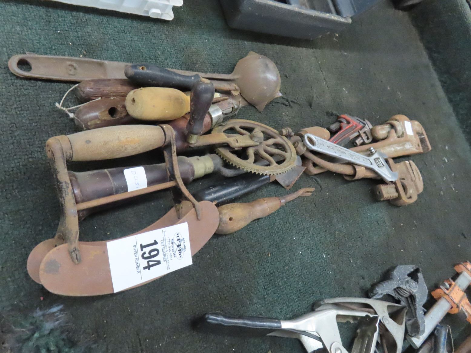 Asst. Pipe Wrenches, Vintage Hand Drills, Tools