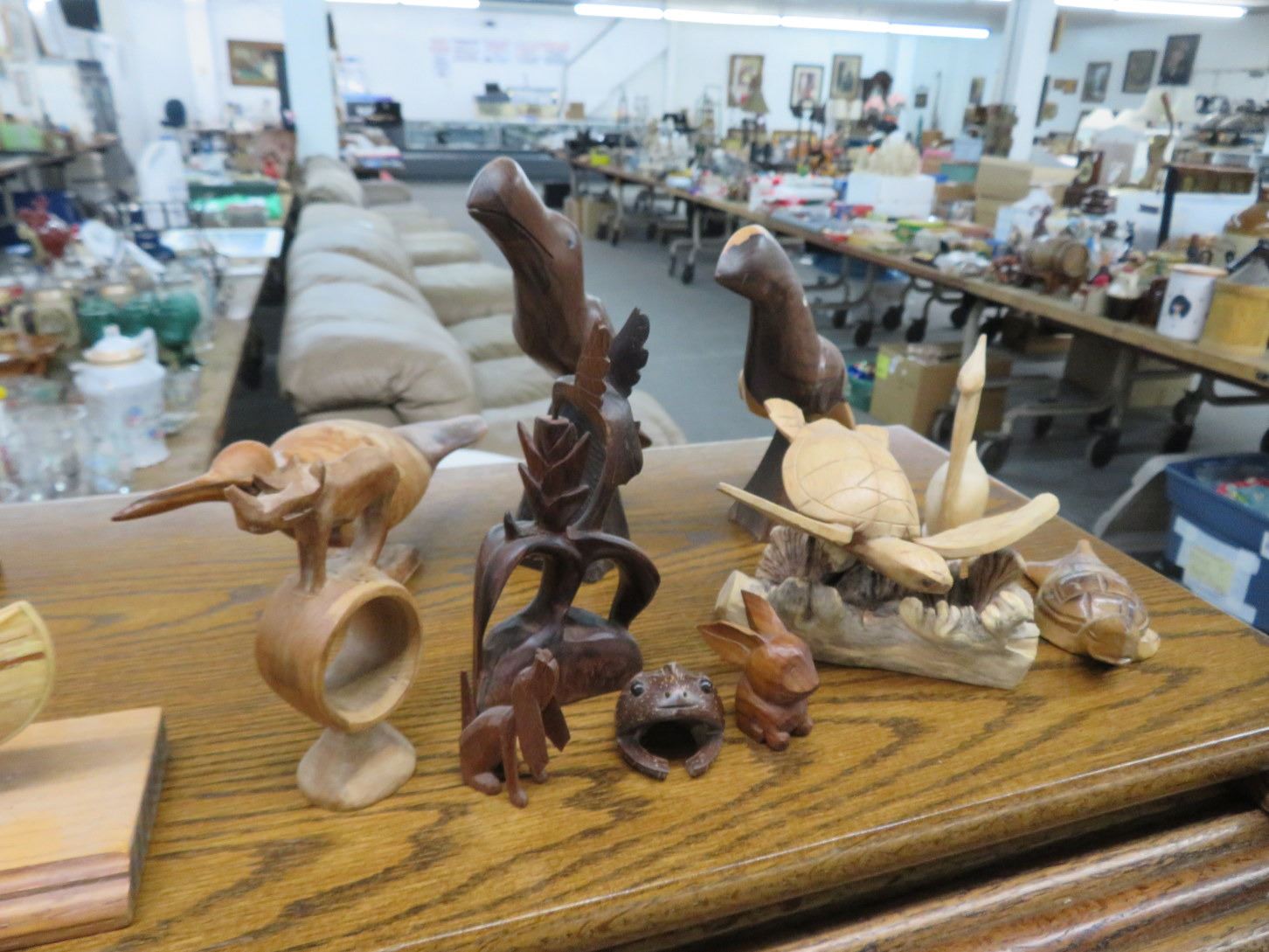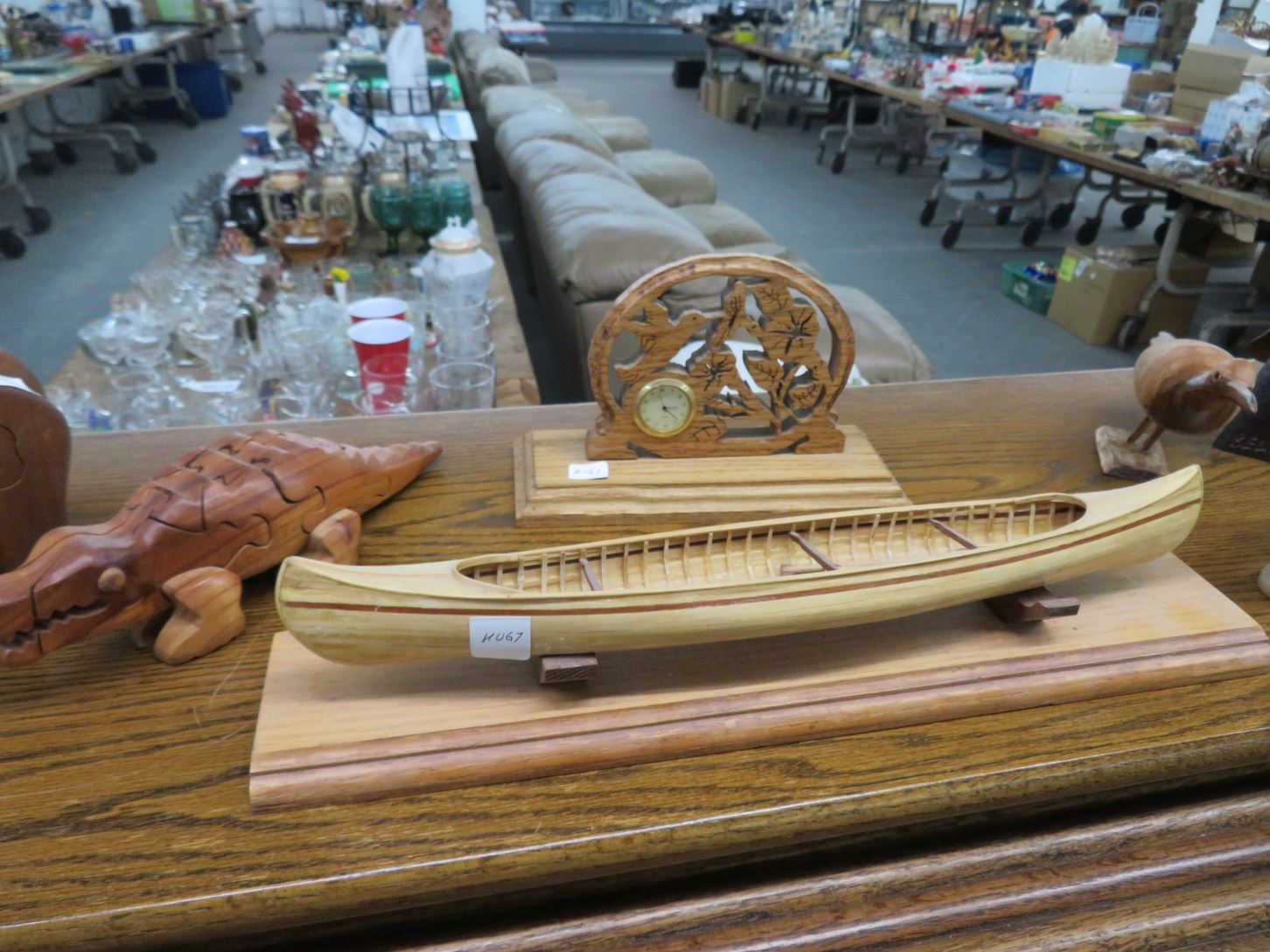 Asst. Wood Puzzle Boxes, Figurines, Canoe and Clock