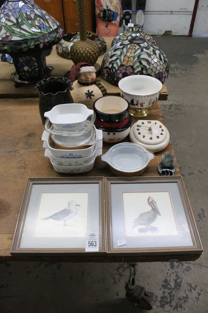 Bakeware, Lavatory Clock, Snowman Jars, Needlepoint Bird Art