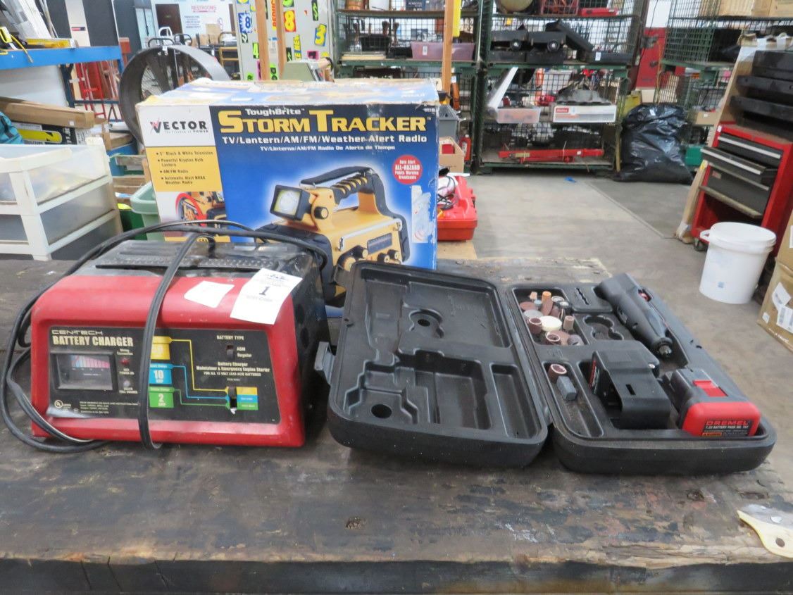Battery Charger, Cordless Dremel Tool, Storm Tracker Weather Radio
