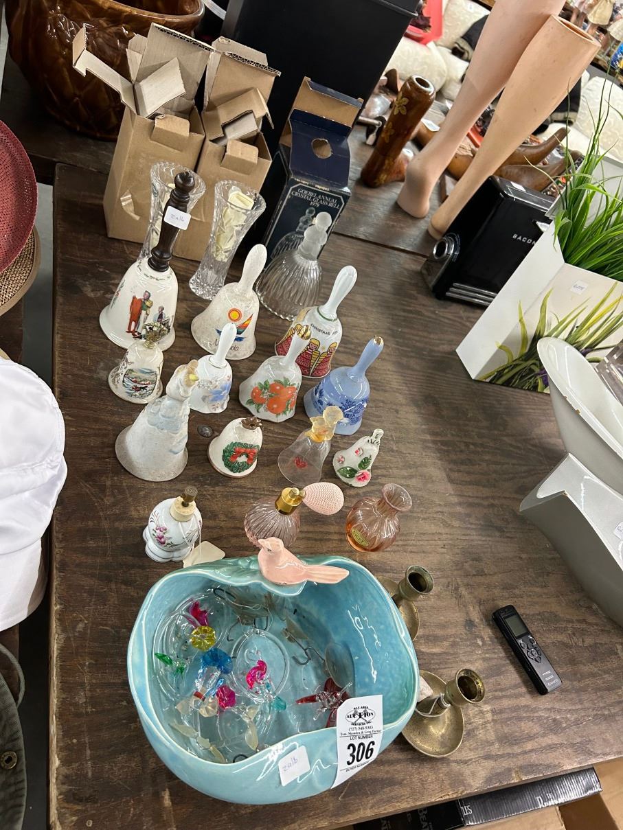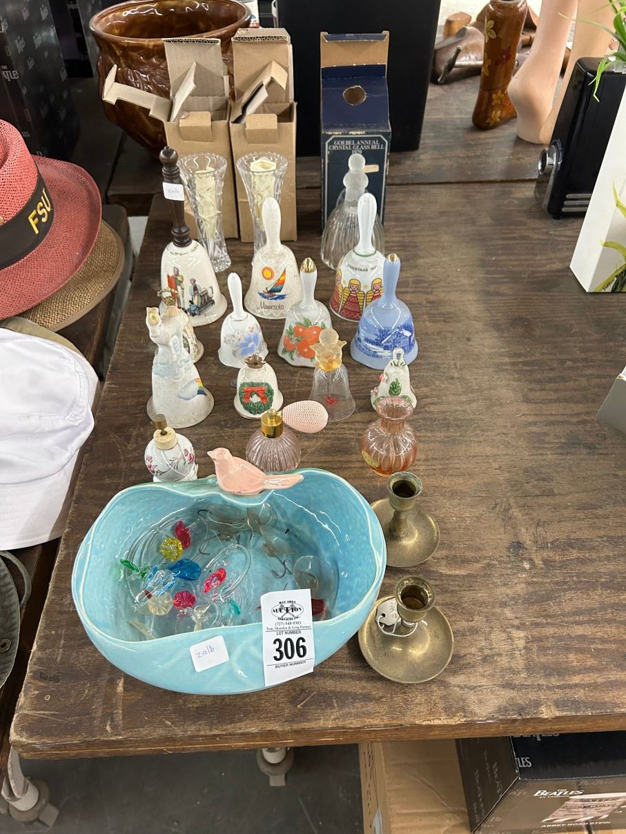 Bell Collection w/Art Glass Bowl, Brass Candlesticks