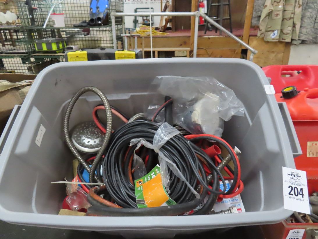 Bin w/Jumper Cables, Shower Head, Asst. Tools/Supplies