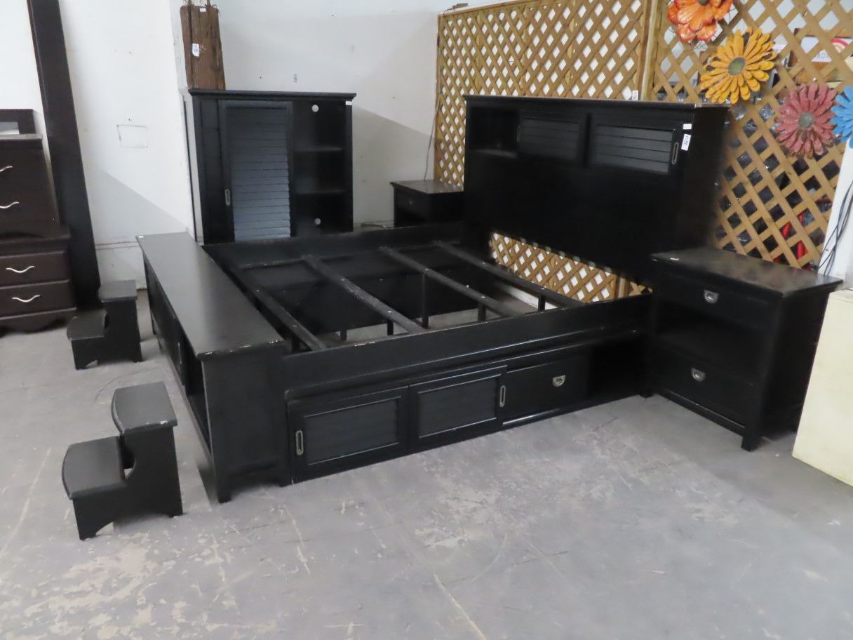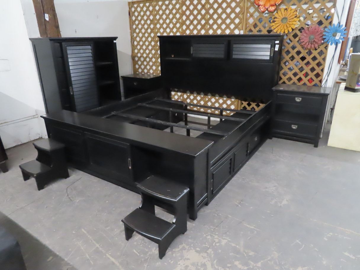 Black King Bed, Wardrobe, Nightstands, Steps Set