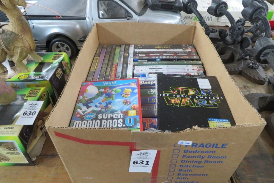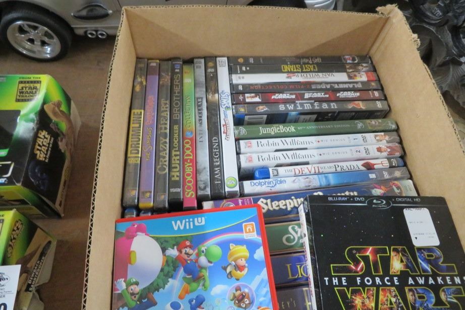 Box Lot of Asst. DVD's, VHS, WII Mario Cart