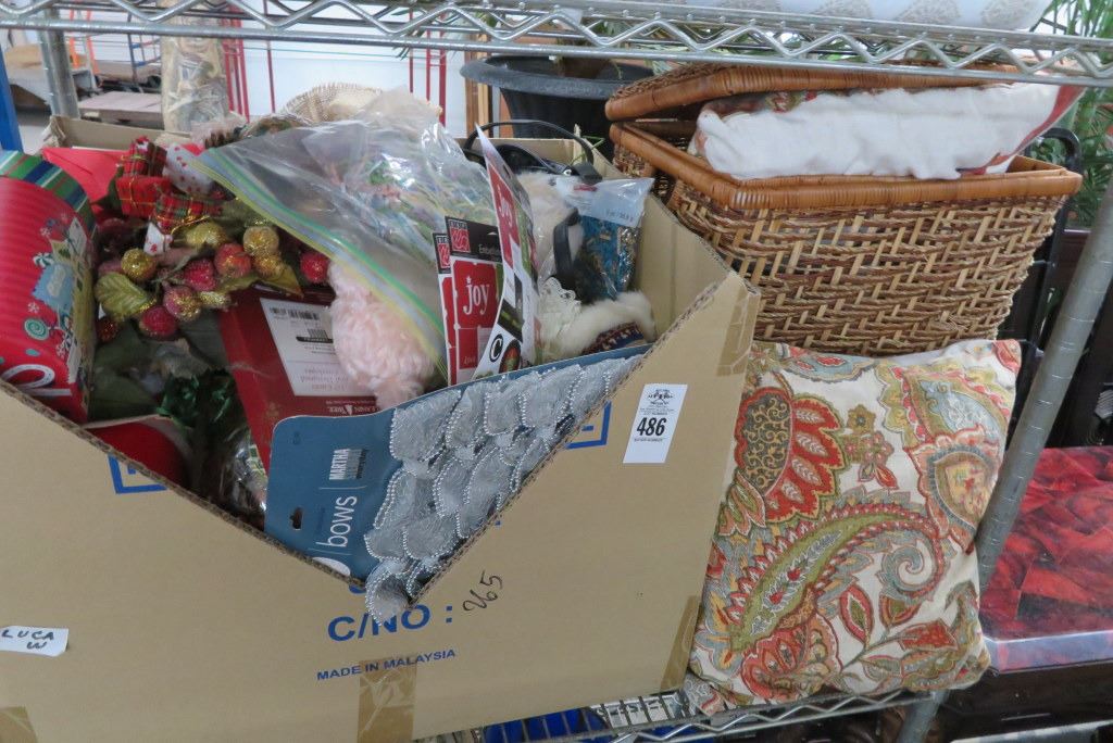 Box of Christmas Supplies, Rattan Bin w/Pillows