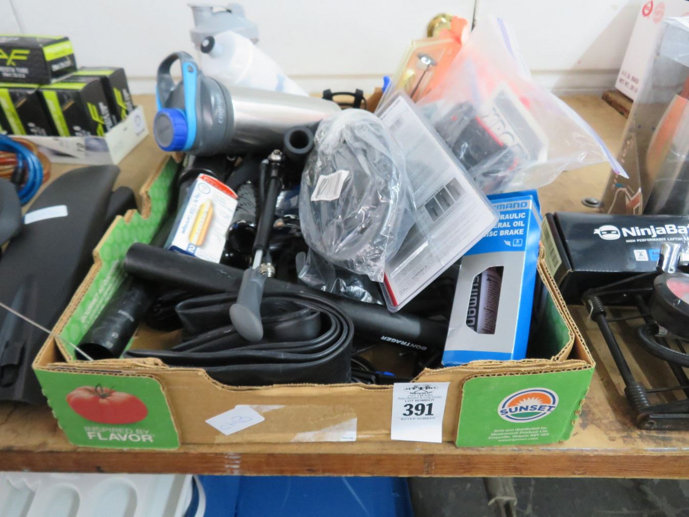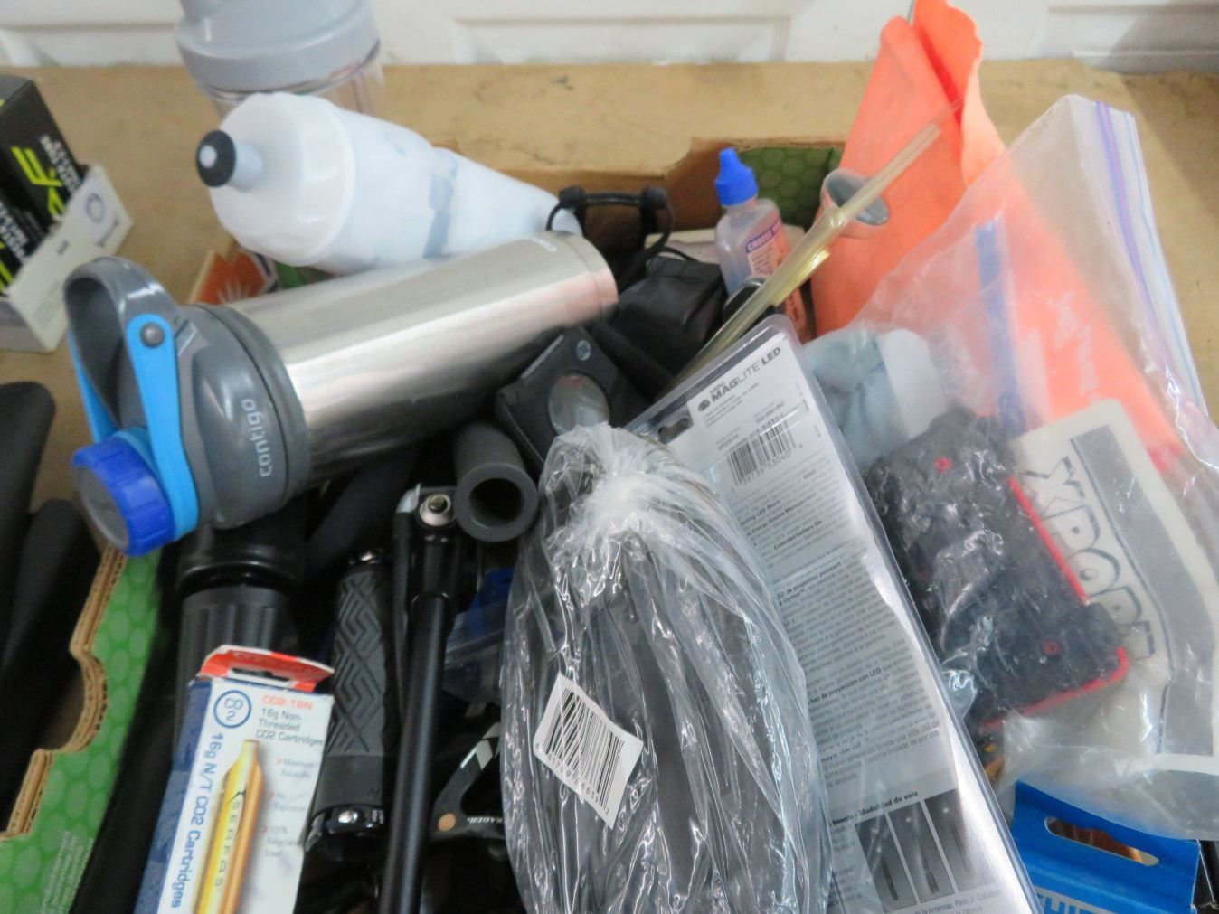 Box of Mini Flashlight, Contigo, Disk Brake Oil, Cartridges