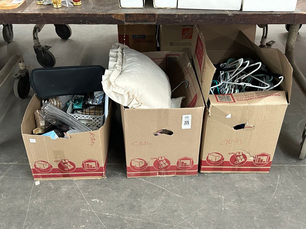 Boxes 3 w/Clothes Hangers, Line Pins, Home Goods