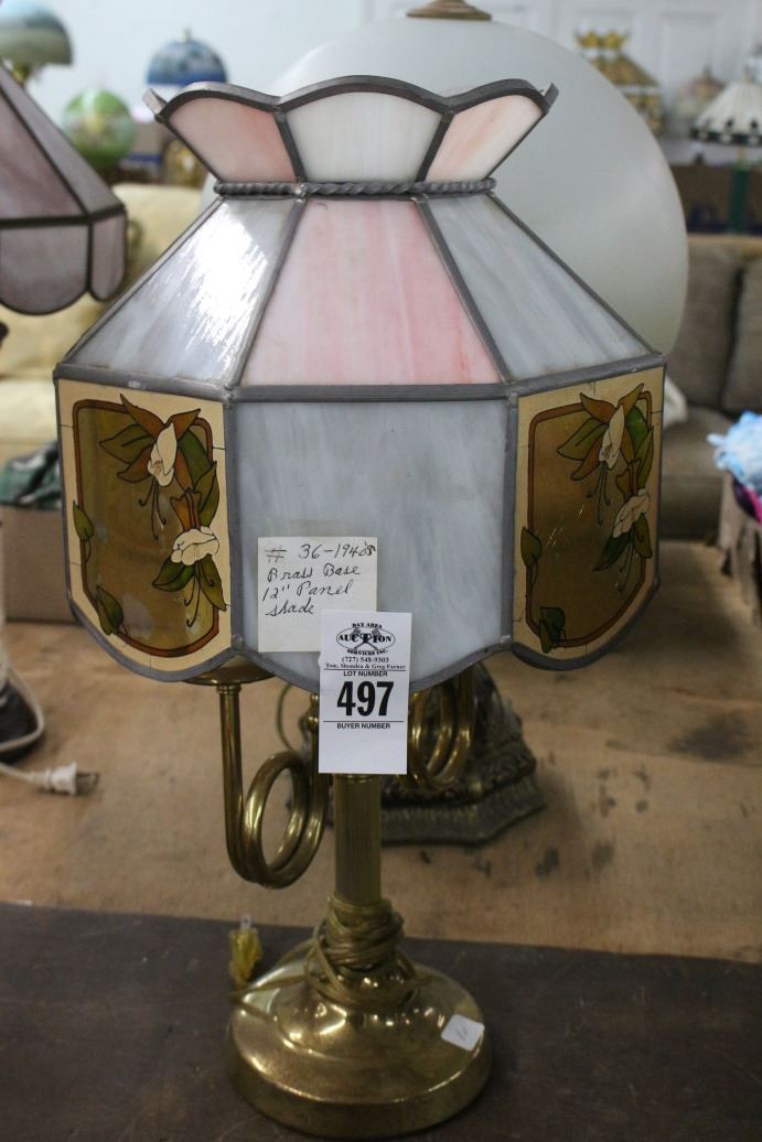 Brass 2 Light Lamp w/Floral Motif Glass Panel Shade