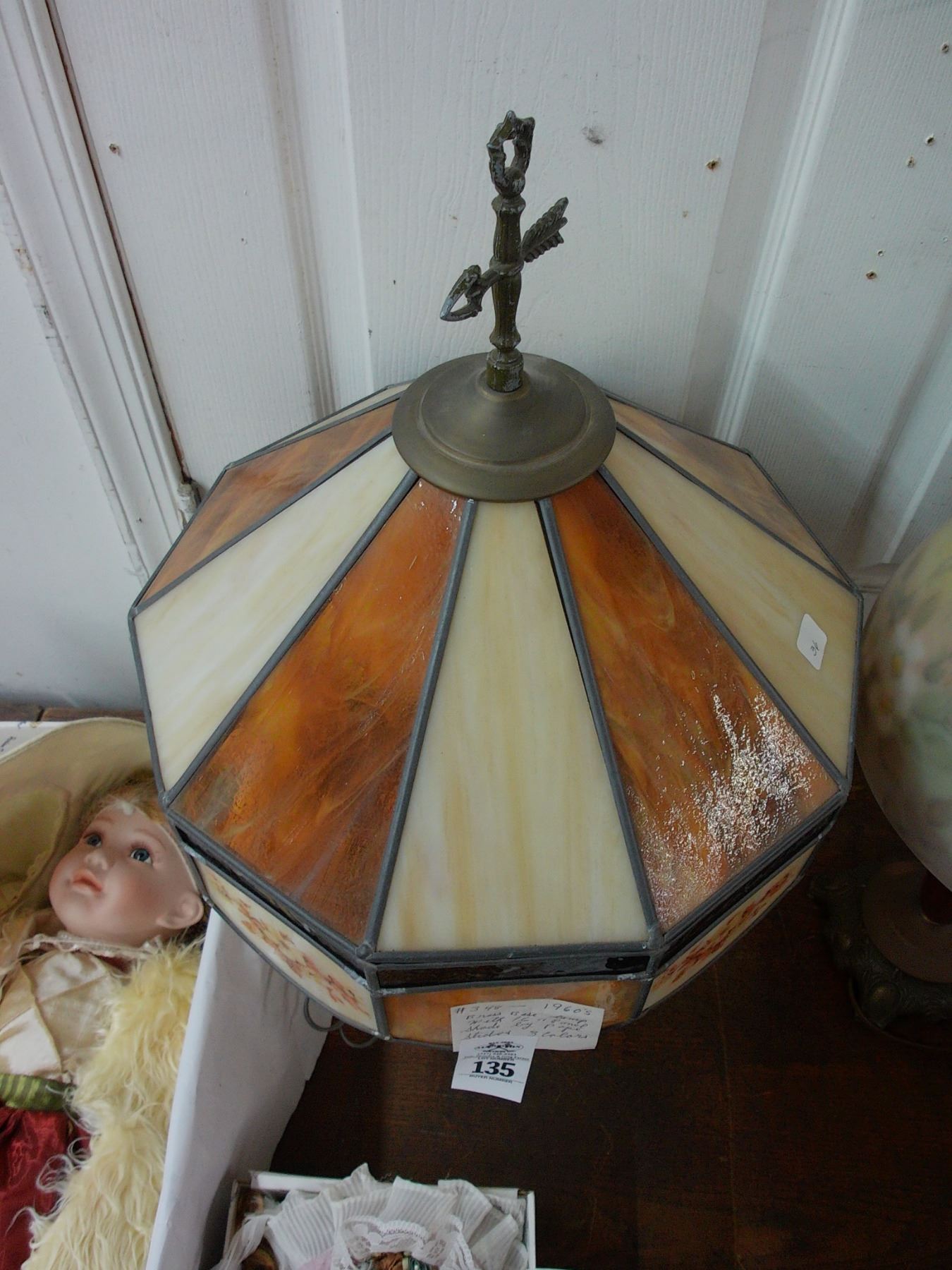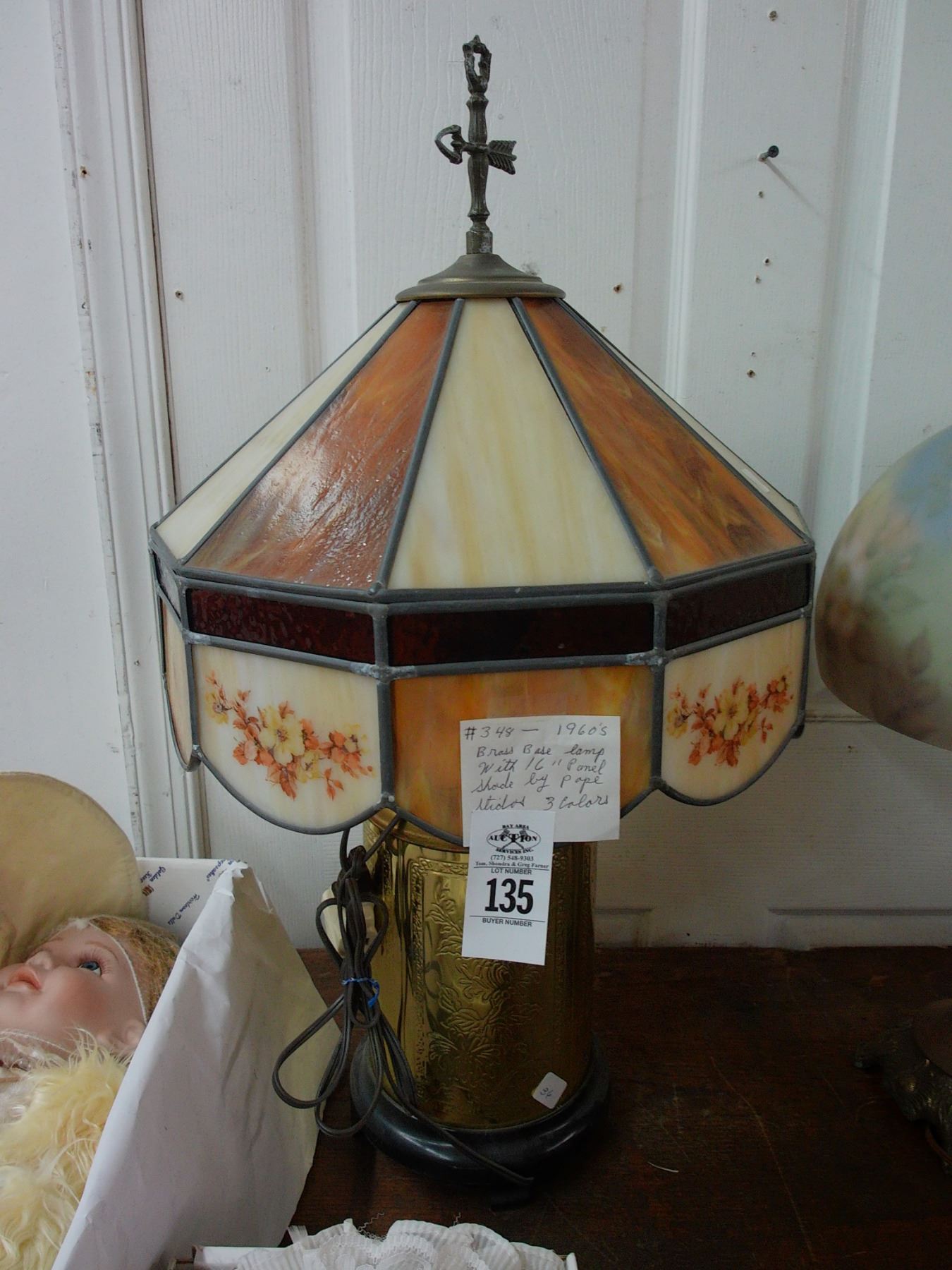 Brass Base Floral Motif Oriental Lamp w/Glass Floral Shade Arrow Crown