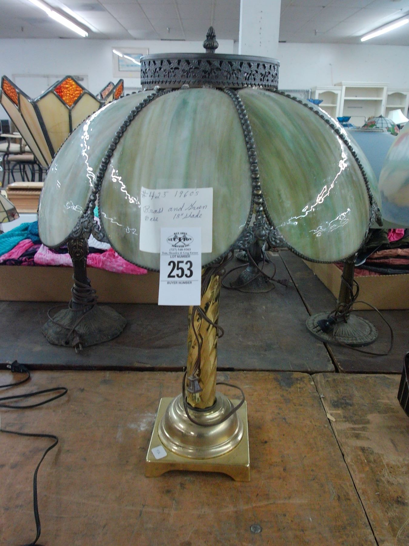 Brass Base Lamp w/Cast Trim Green Glass Panel Shade