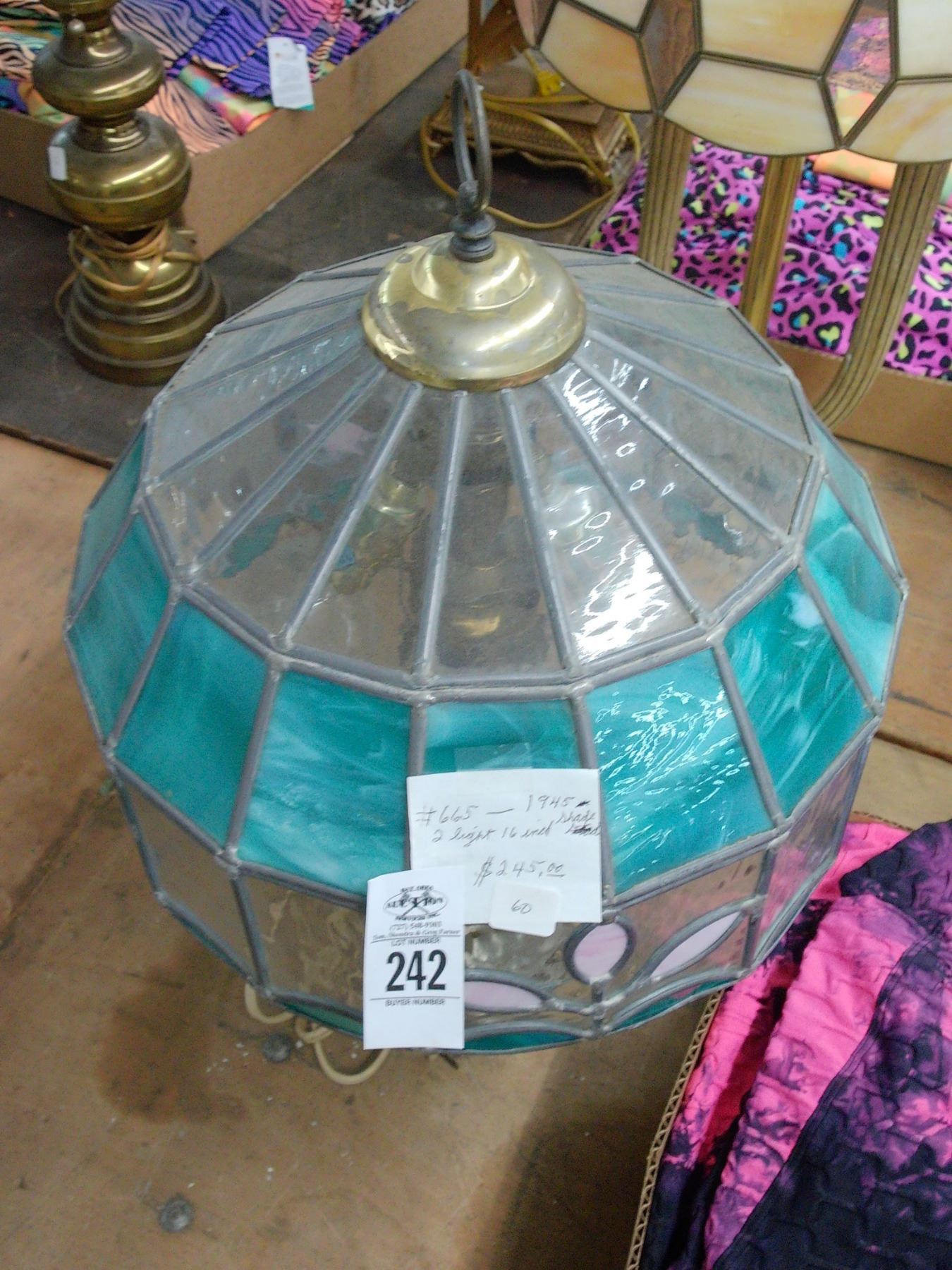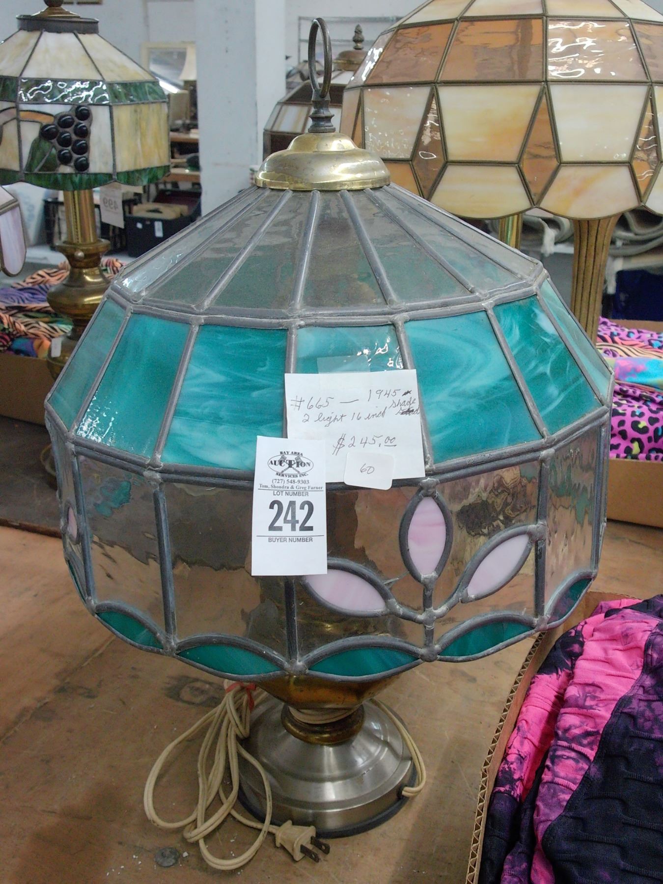 Brass Base Lamp w/Floral Leaded Glass Shade