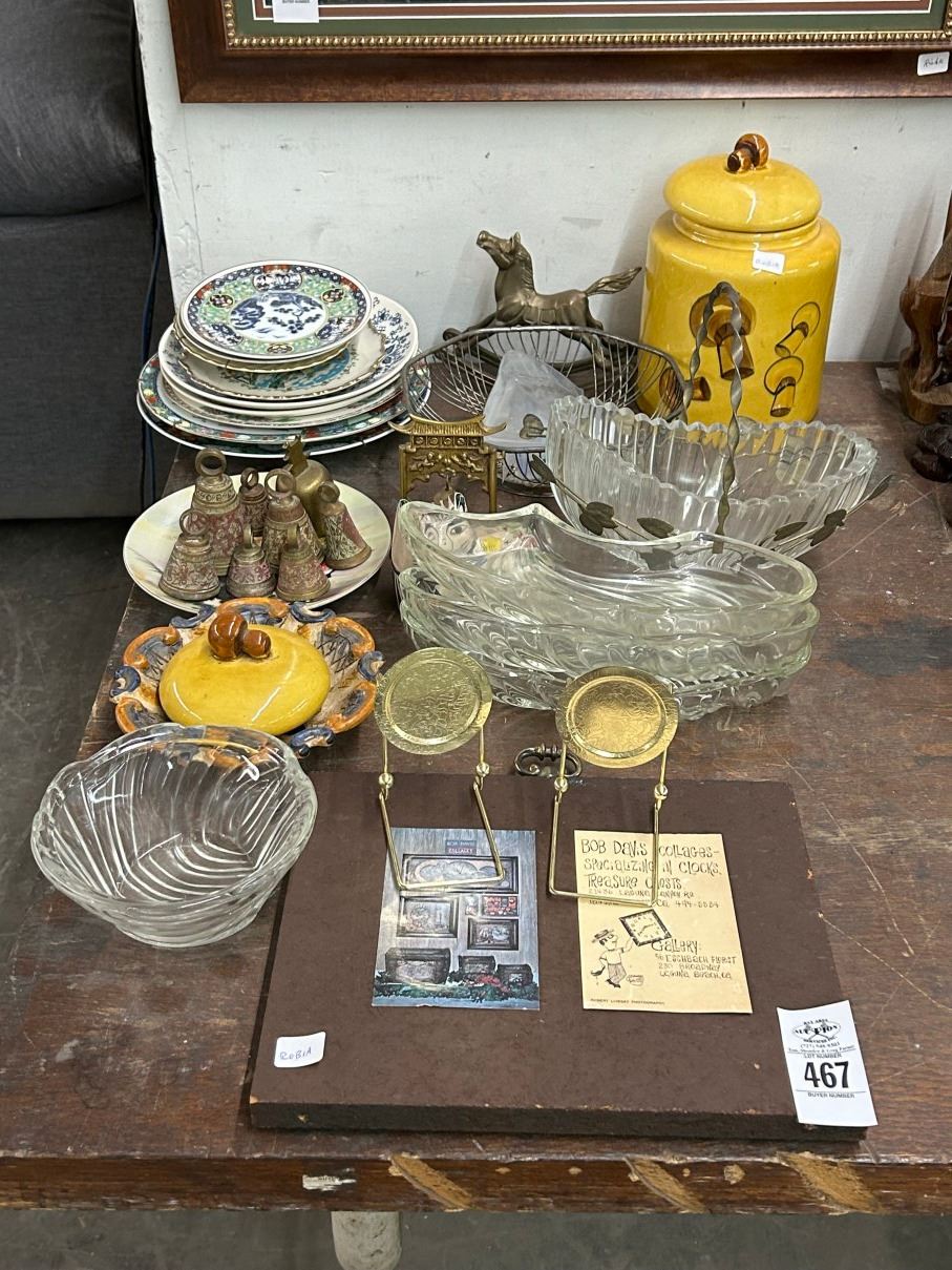 Brass Rocking Horse, Bells, Plaque, Dishes, Jar