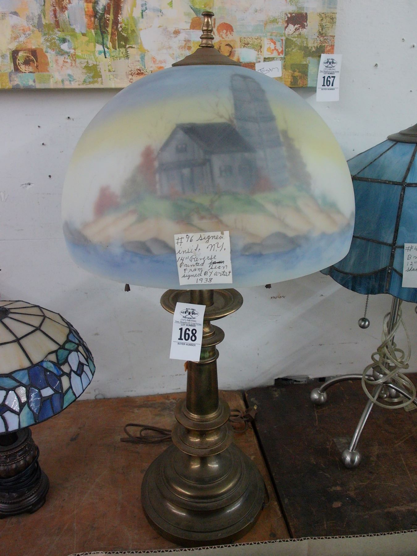 Brass Vintage Lamp w/Reversed Painted Lighthouse Glass Shade
