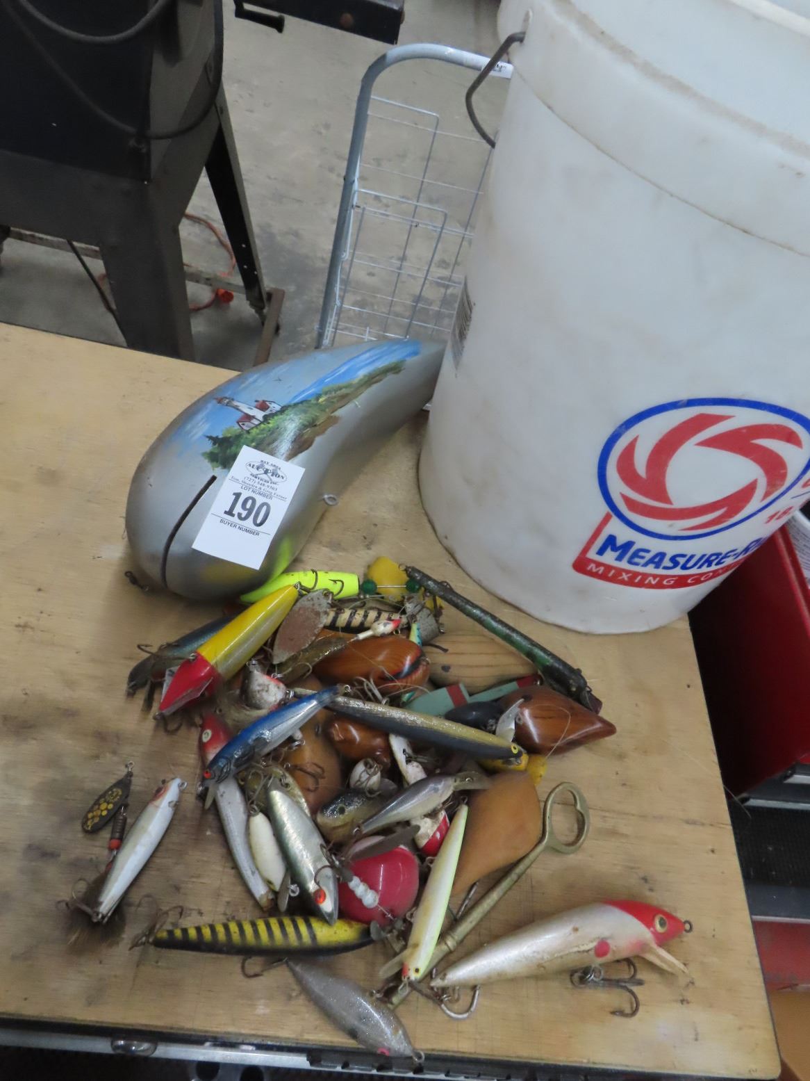 Bucket w/Vintage Fishing Lures, Painted Bobber