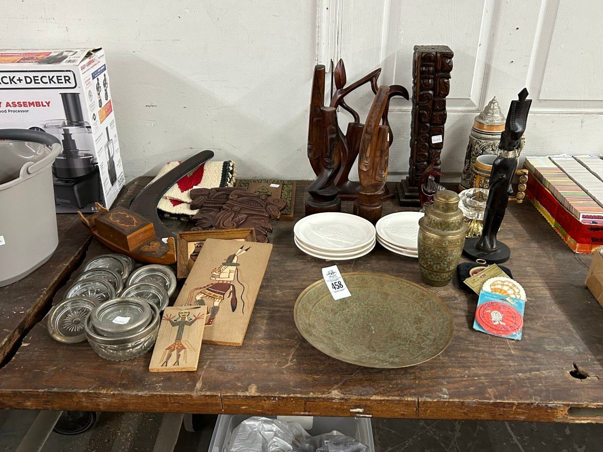 Carved and Asst. Wall Art, Indian Blanket, Silver Rimmed Coasters, Steins, Décor