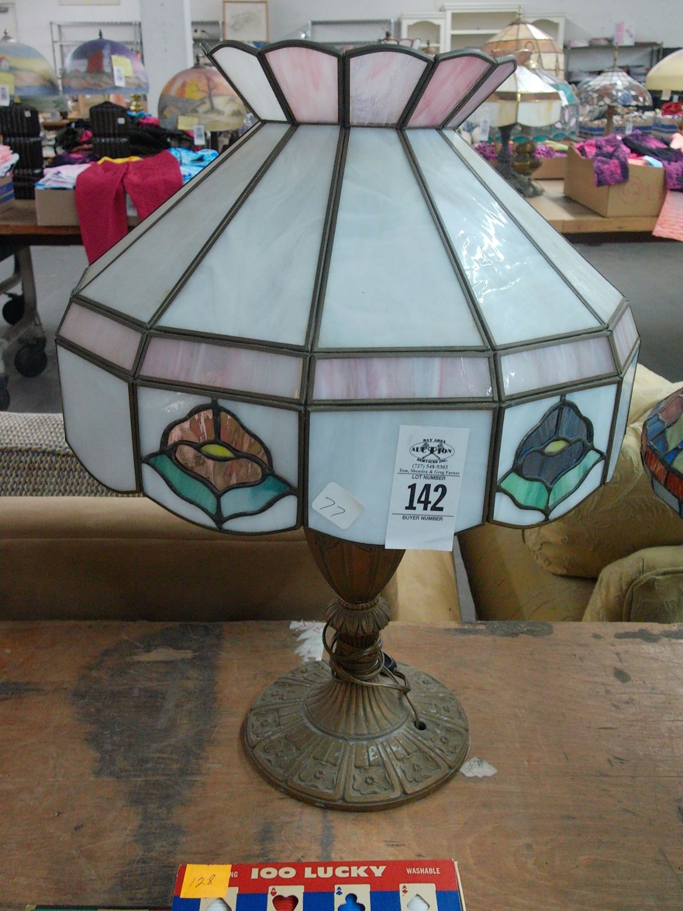 Cast Floral Base Lamp w/Glass Panel Floral Motif Shade