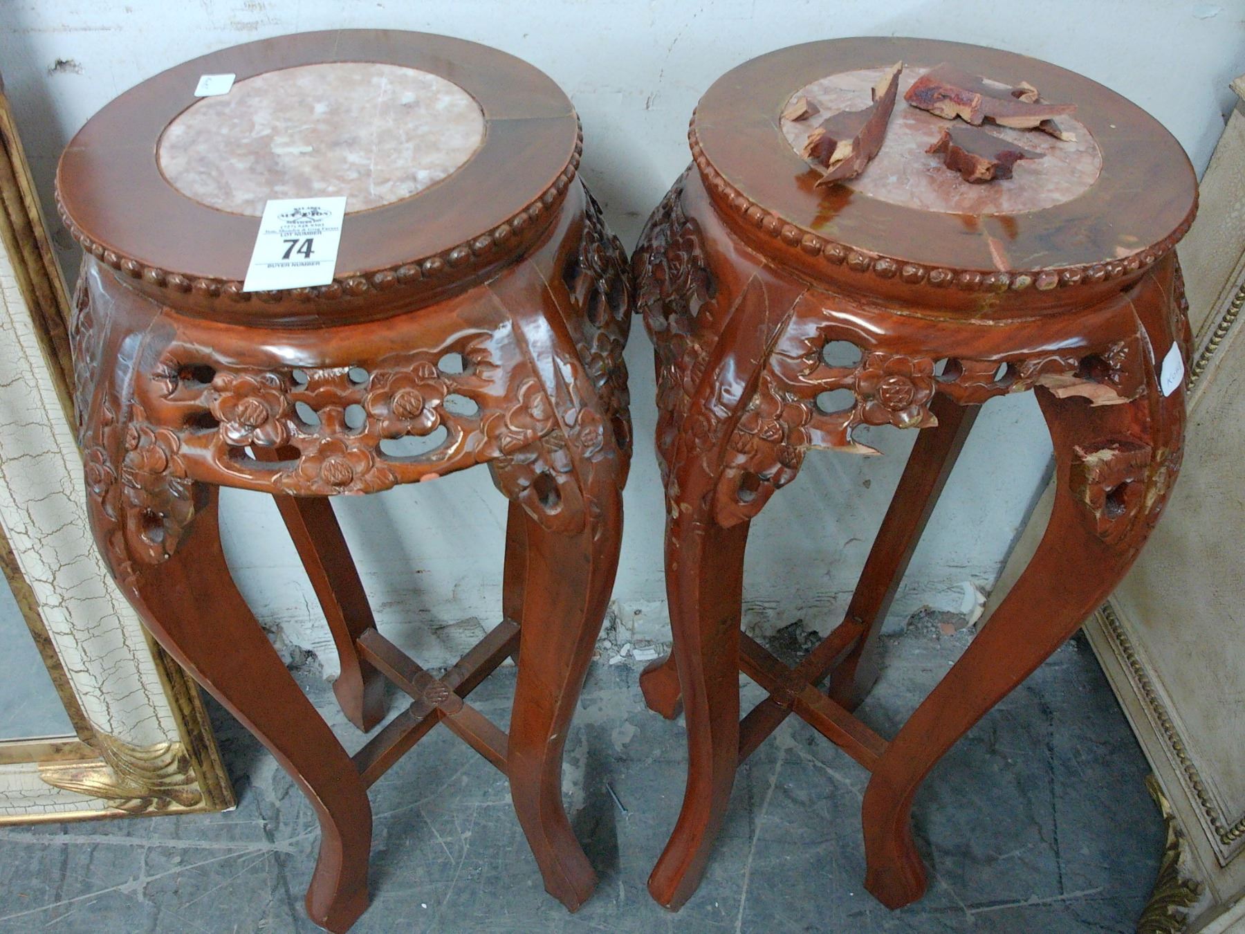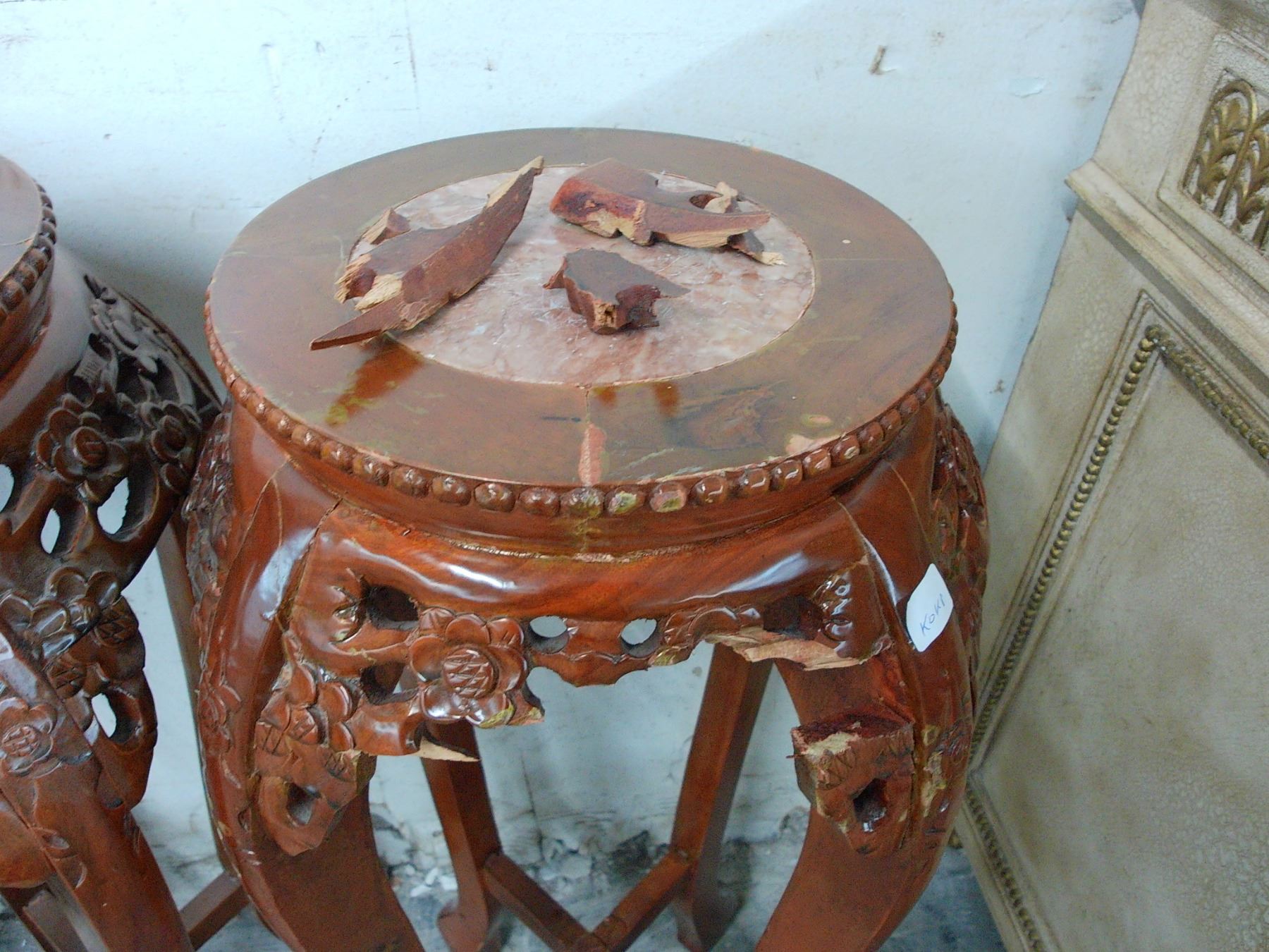 Cherry w/Marble Inlay Ornate Carved Pedestals - Pair - (One Damaged)