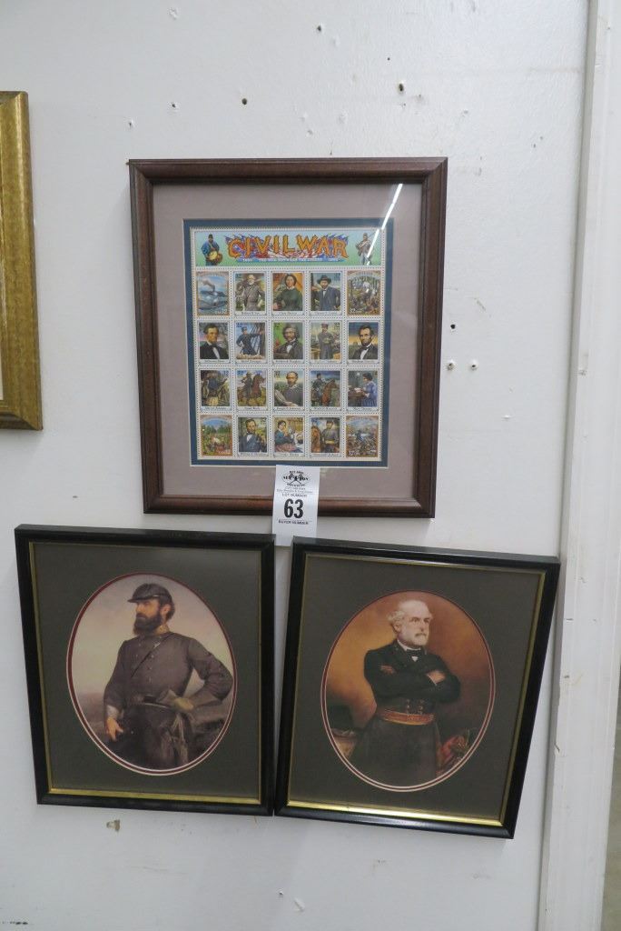 Civil War Framed General Prints & Stamps 9" x 11" (3)
