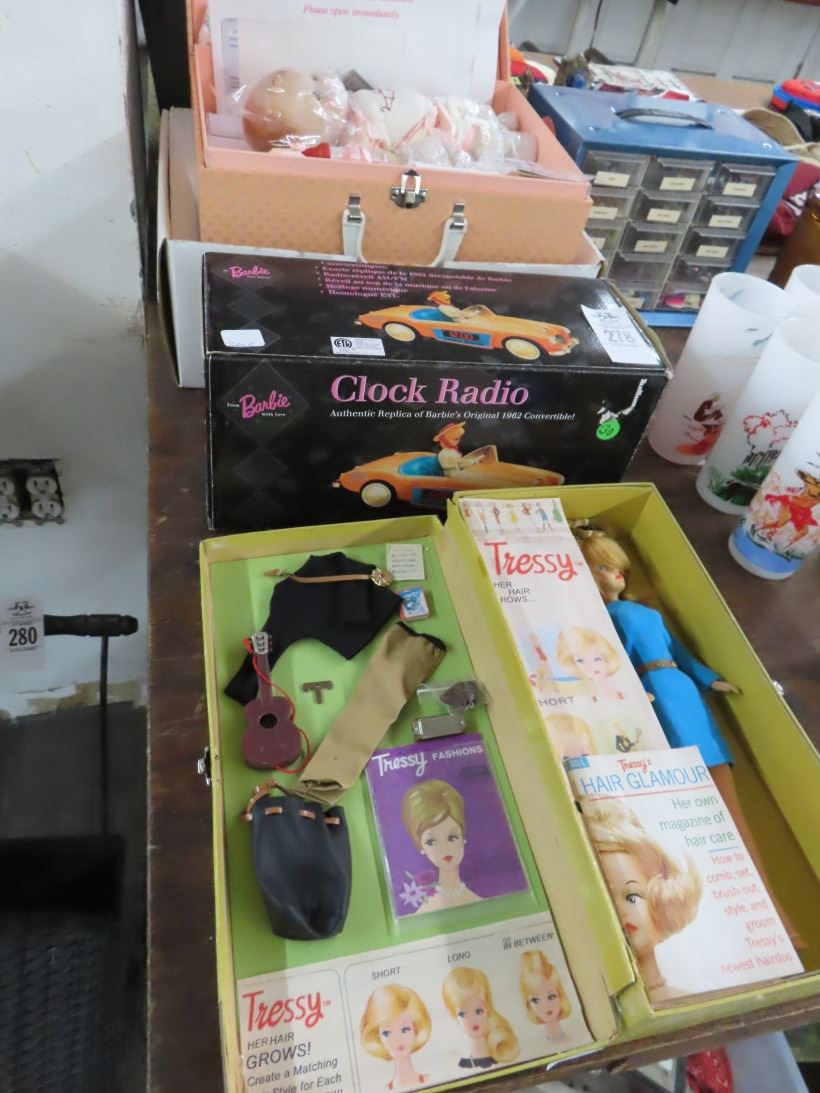 Clock Radio, Dolls, Parts Bin w/Doll Accessories