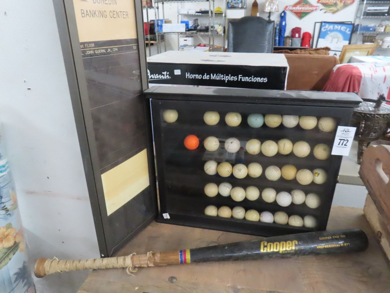 Cooper Vintage Baseball Bat, Golf Ball w/Showcase, Banking Center Reader Board