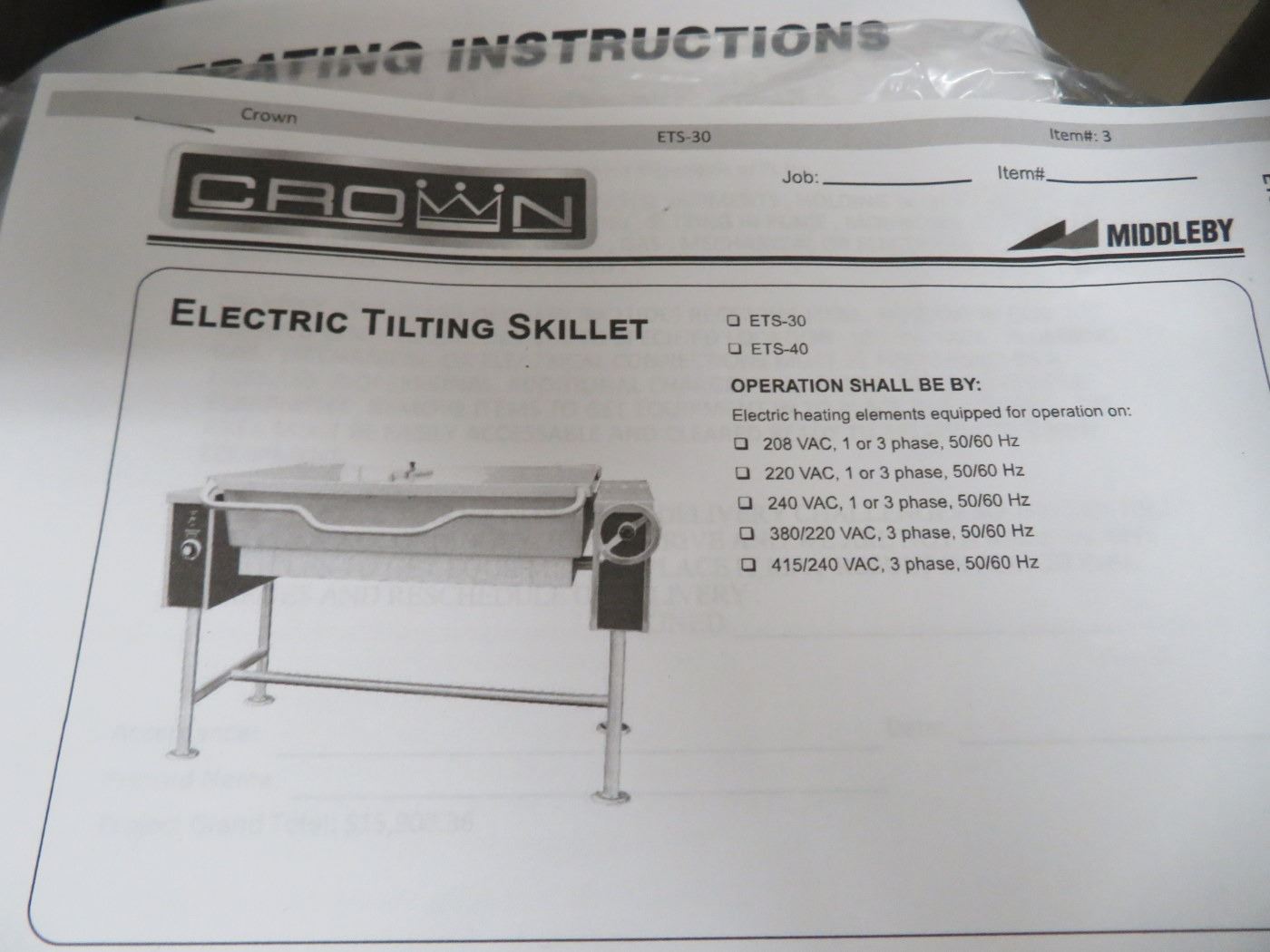 Crown ETS30 Electric Tilting Skillet - Subject to Owner Approval