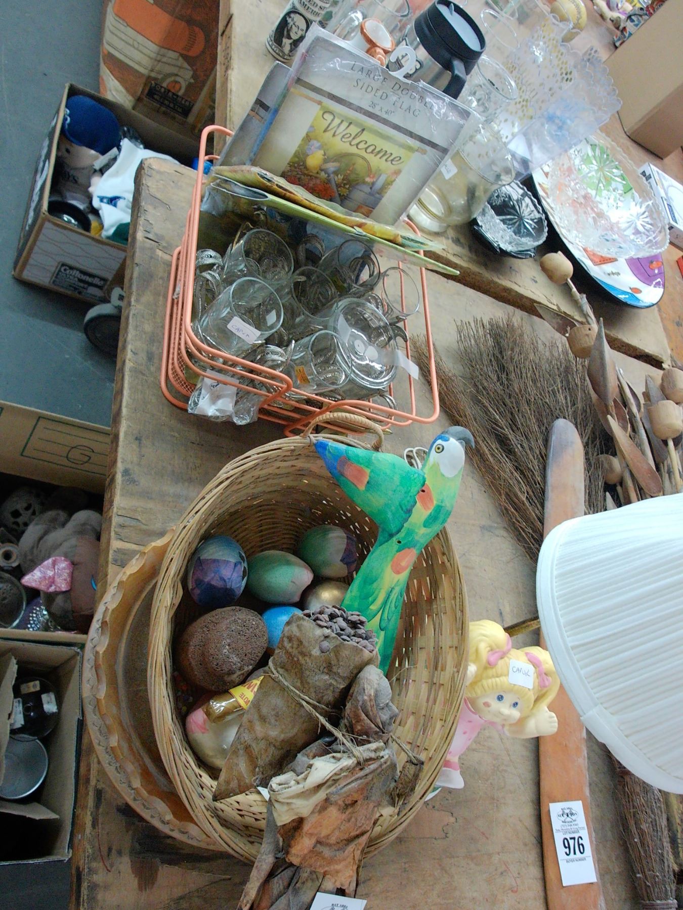 Doll Lamp, Figurines, Eggs, Basket w/Glassware