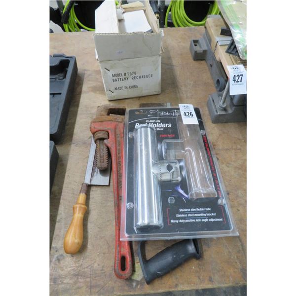 Battery Recharger, Pipe Wrench, Hand Saws & Rod Holder